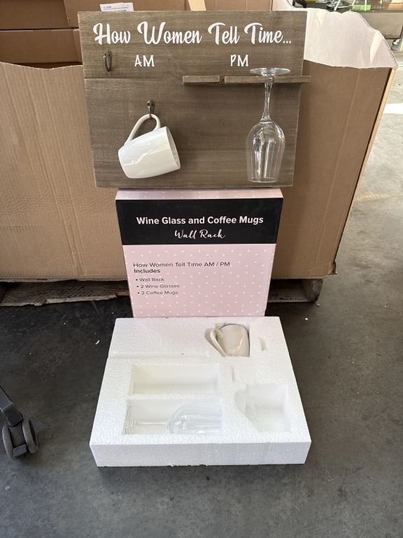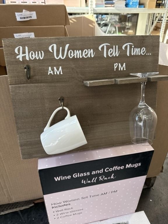 HOW WOMEN TELL TIME AM / PM WALL RACK GIFT SET, WITH RACK, 2 WINE GLASSES AND 2 WHITE CERAMIC MUGS, ALL DISHWASHER SAFE