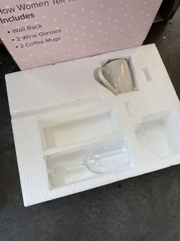 HOW WOMEN TELL TIME AM / PM WALL RACK GIFT SET, WITH RACK, 2 WINE GLASSES AND 2 WHITE CERAMIC MUGS,