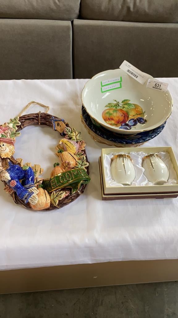 HUMLEBAEK DENMARK PLATE, GLADSTONE BONE CHINA PLATE, BOHEMIAN CZECH BOWL AND WELCOME WALL HANGING AND PORCELAIN SALT AND PEPPER