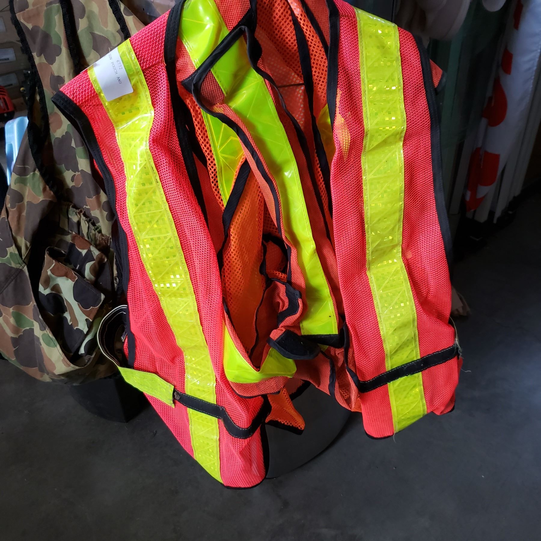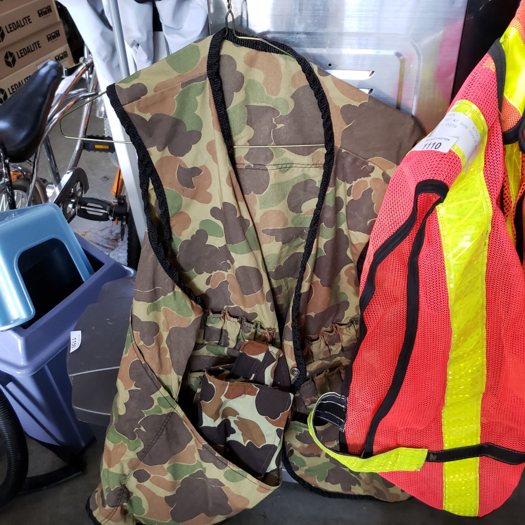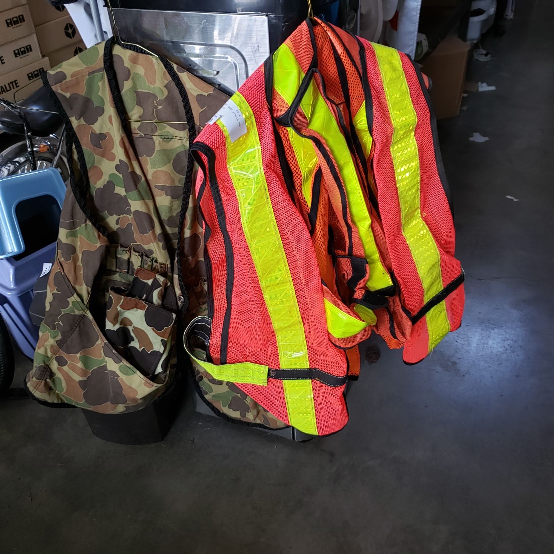 HUNTING VEST W/ GUN POUCH AND 3 HIGH VIS VESTS