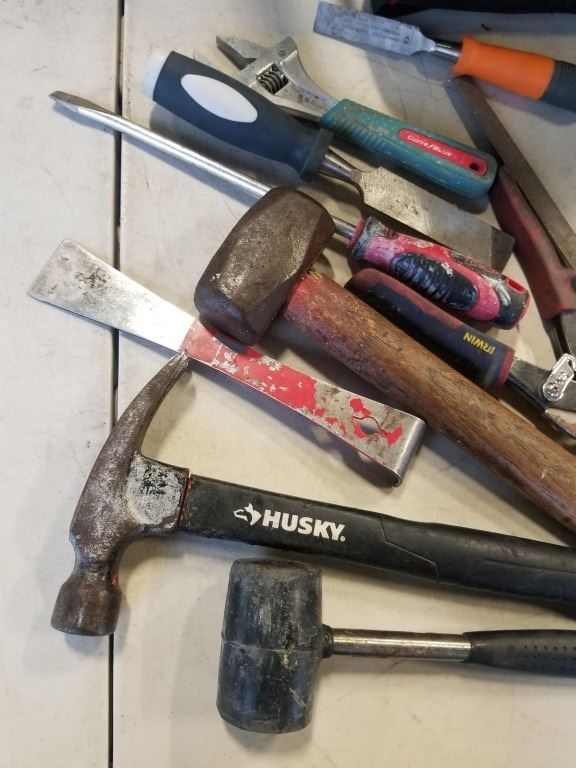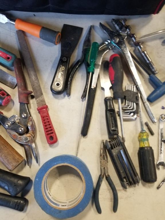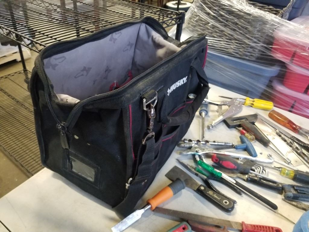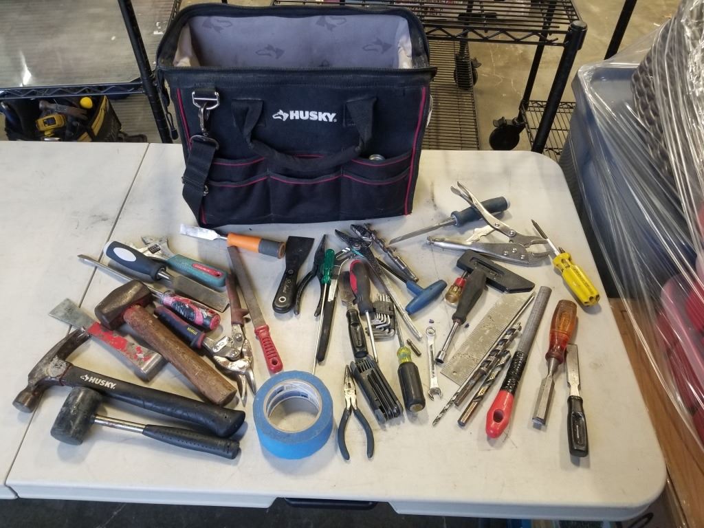 HUSKY TOOL BAG WITH TOOLS, INCLUDES HAMMERS, PLIERS, SCREWDRIVERS