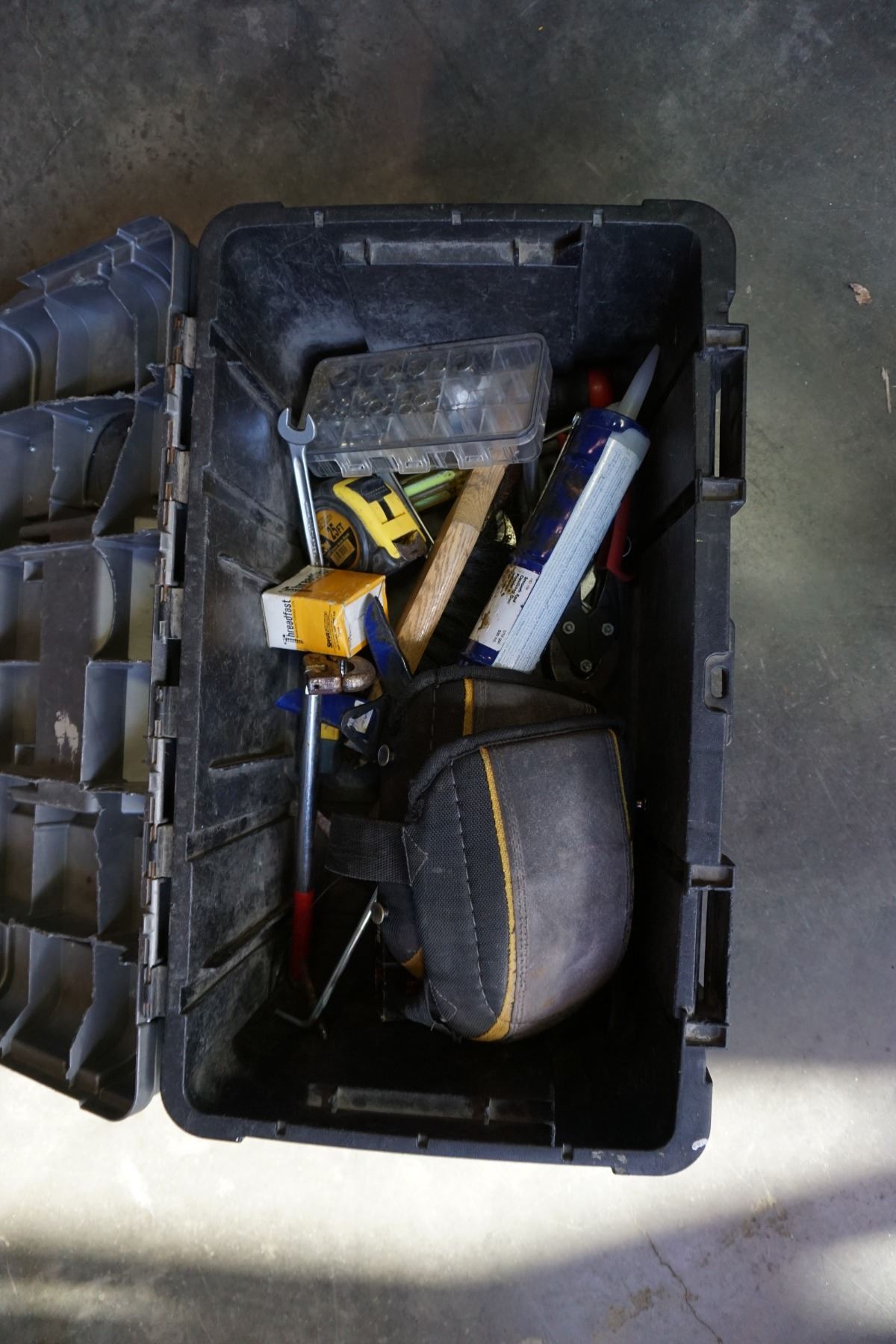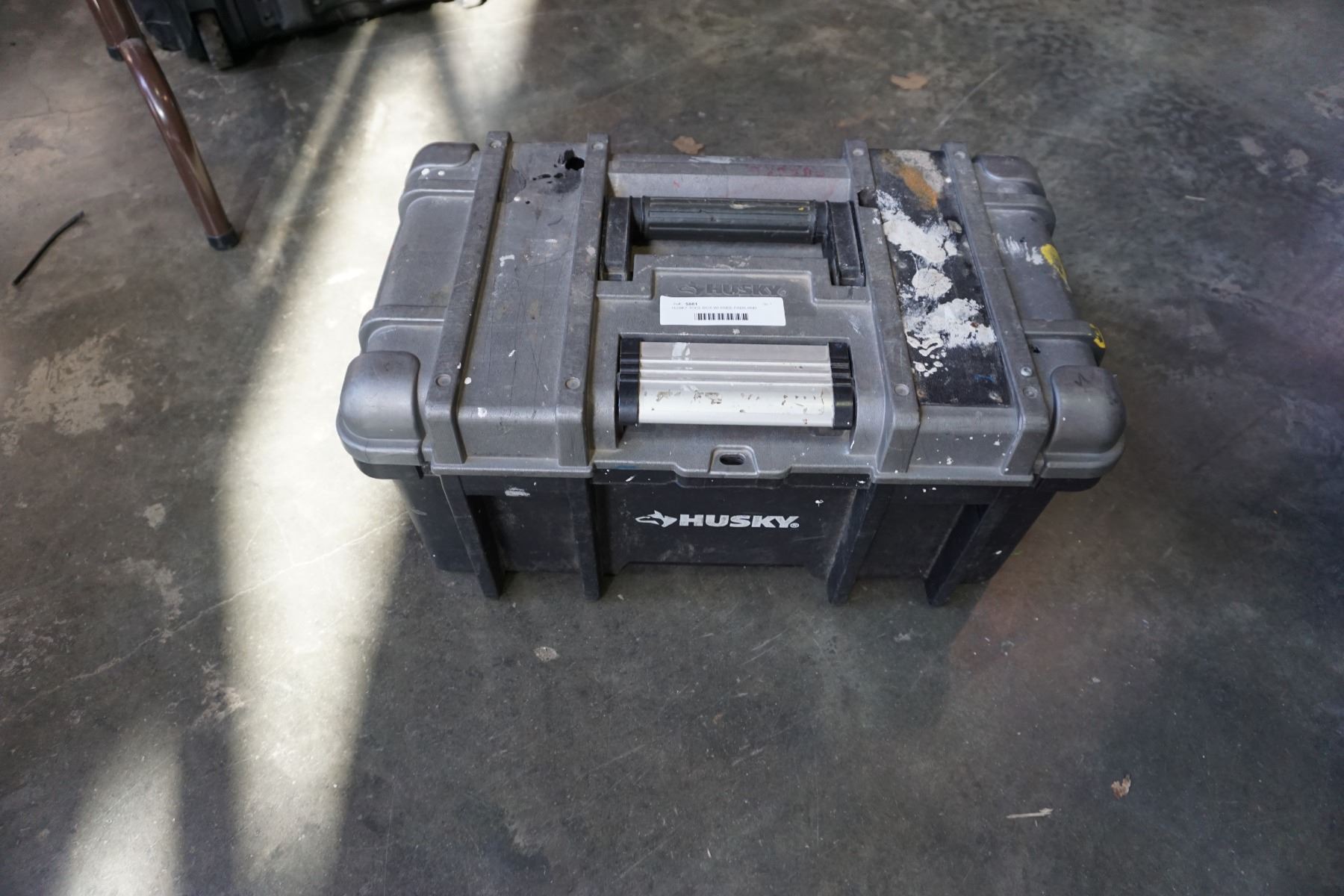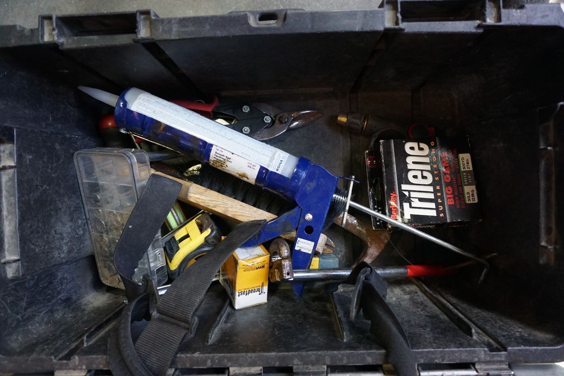 HUSKY TOOL BOX W/ KNEE PADS AND ASSORTED HAND TOOLS