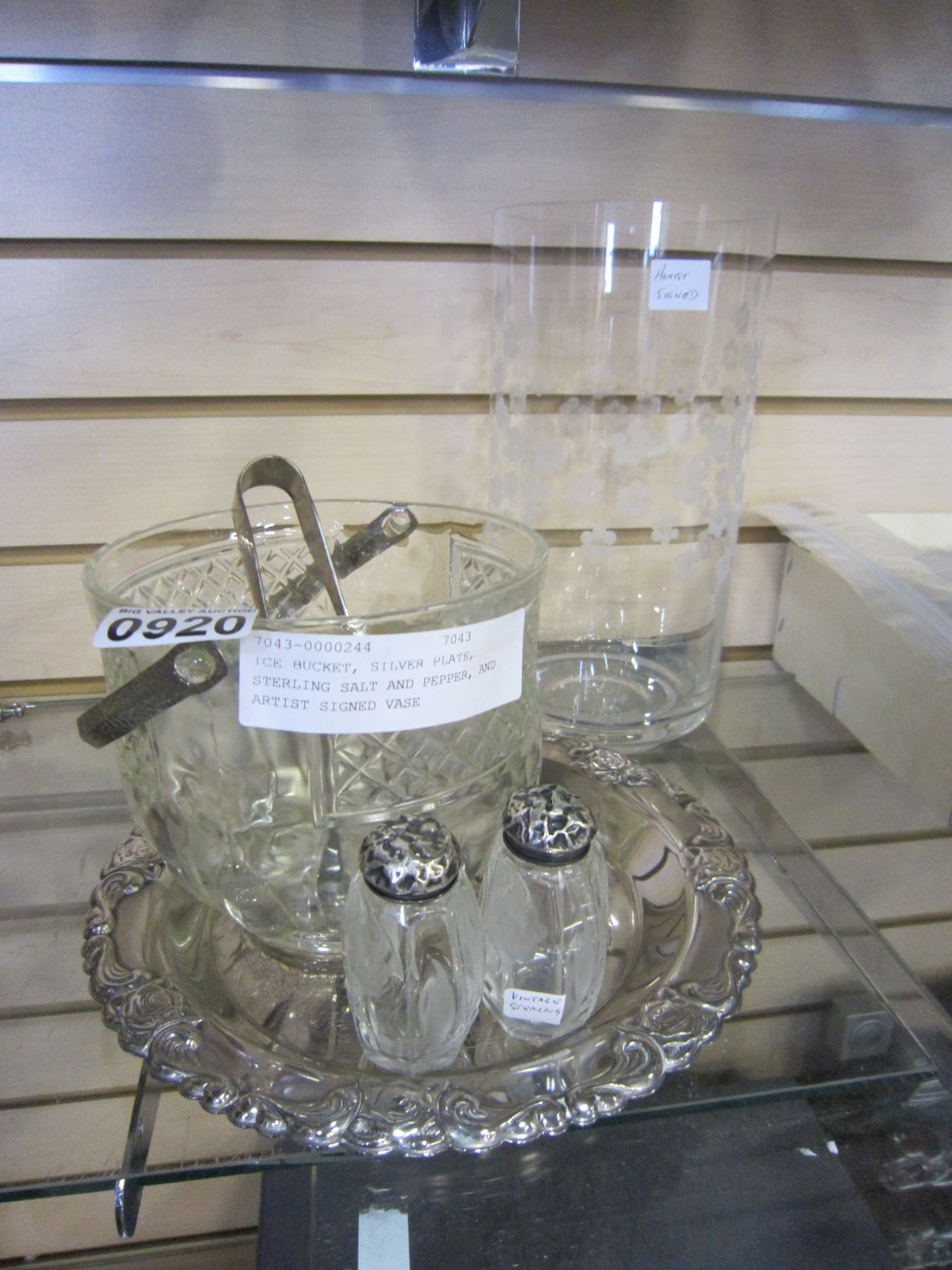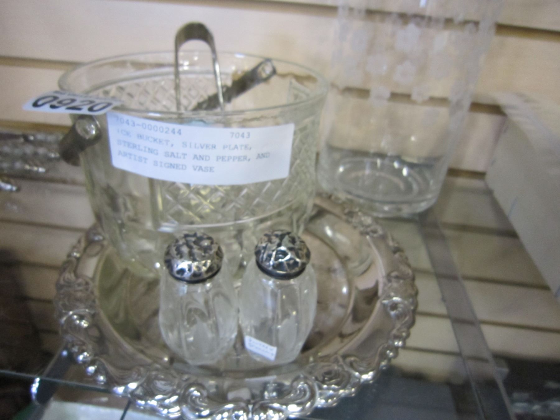 ICE BUCKET, SILVER PLATE, STERLING SALT AND PEPPER, AND ARTIST SIGNED VASE
