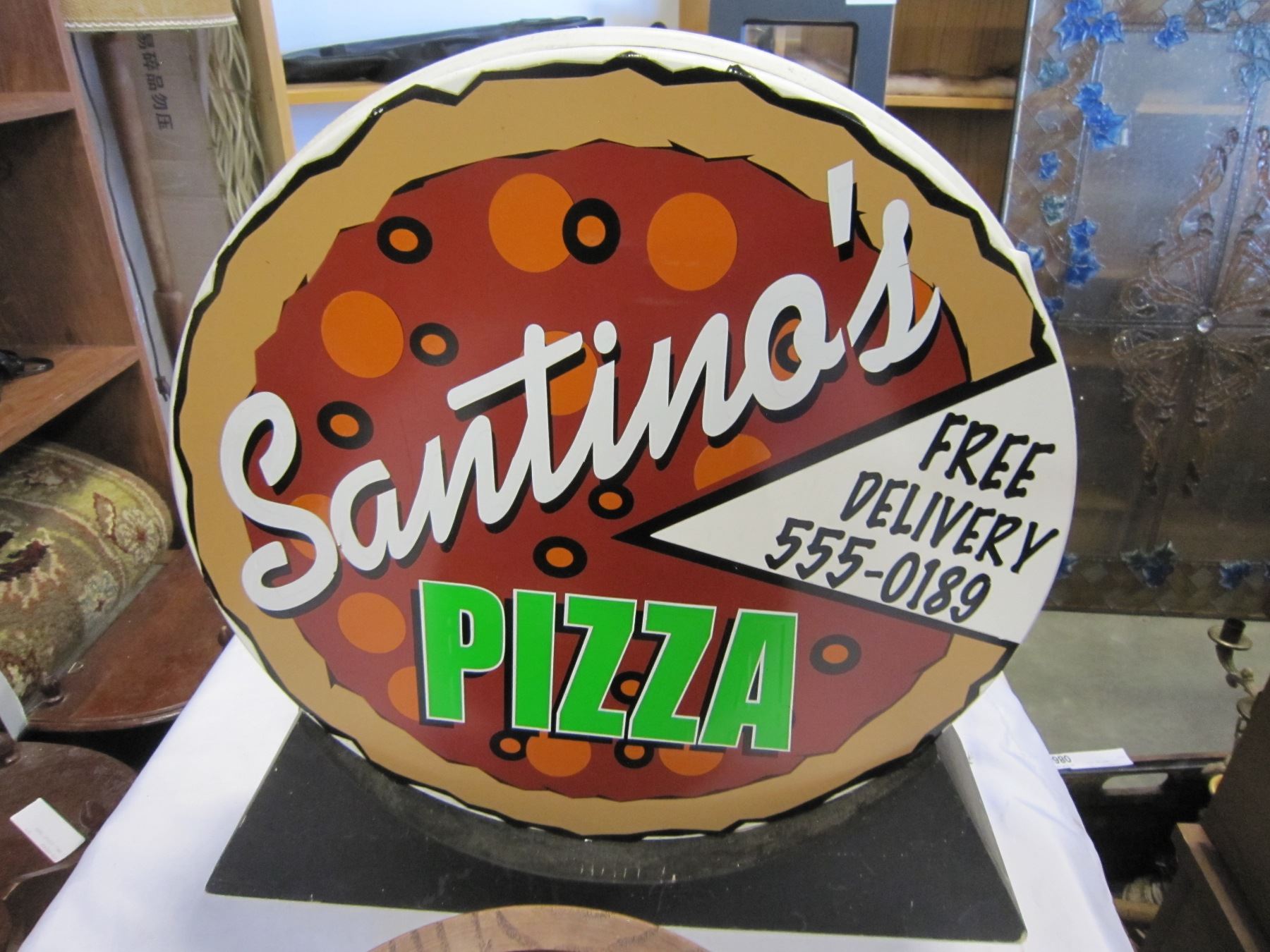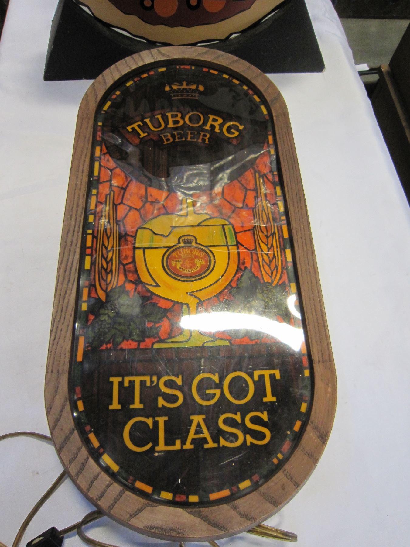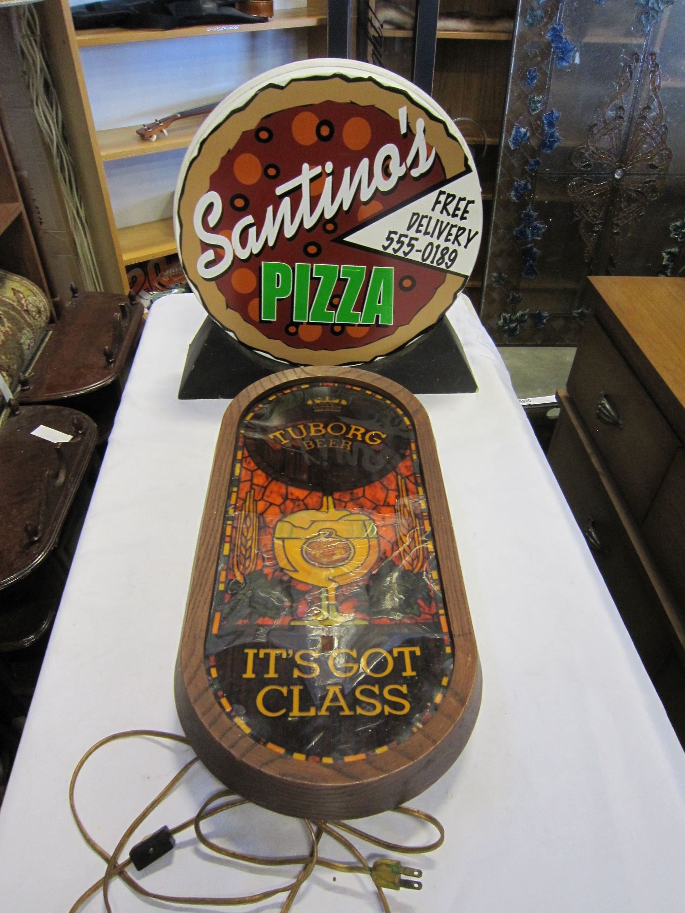 ILLUMINATED TUBORG BEER ADVERT AND SANTINOS PIZZA SIGN