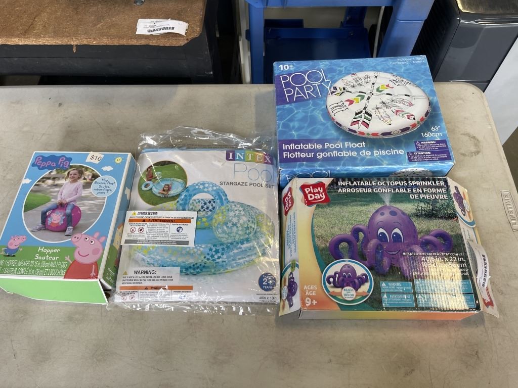 INFLATABLE SWIMMING POOL, OCTOPUS SPRINKLER, KIDS CHAIR AND BLOW UP TOY