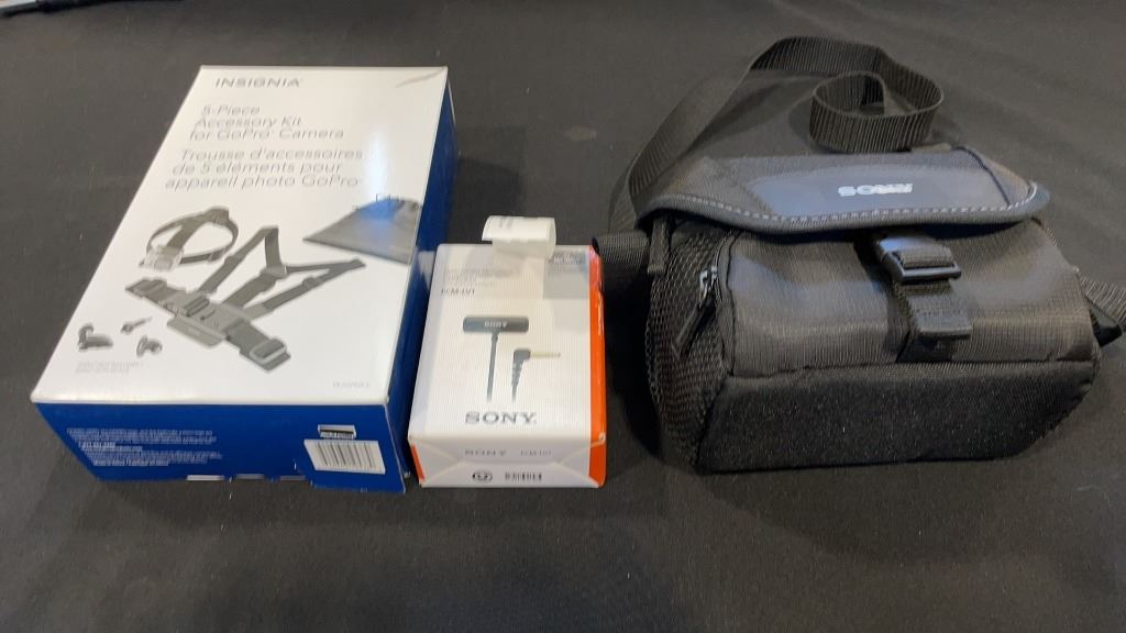 INSIGNIA 5 PIECE GO PRO ACCESSORY KIT, SONY CAMERA BAG AND SONY CAMERA MICROPHONE