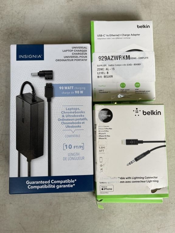 INSIGNIA 90 WATT UNIVERSAL LAPTOP CHARGER, BELKIN USB-C TO ETHERNET CHARGE ADAPTOR, AUDIO CABLE TO LIGHTNING, AND AUDIO AND CHARGE ROCKSTAR CABLE