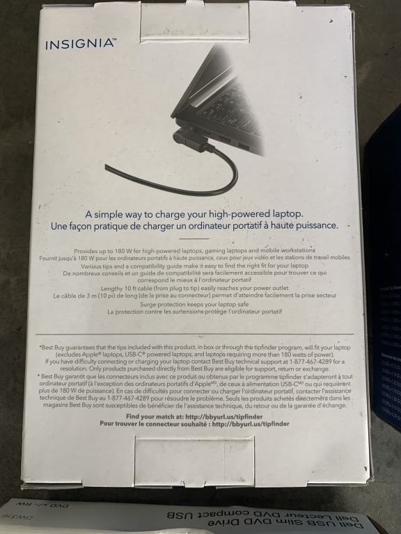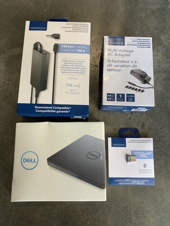 INSIGNIA HIGH POWER UNIVERSAL 180W LAPTOP CHARGER, MULTI VOLTAGE AC ADAPTER, BLUETOOTH 5.0 USB ADAPTER AND DELL USB SLIM DVD DRIVE
