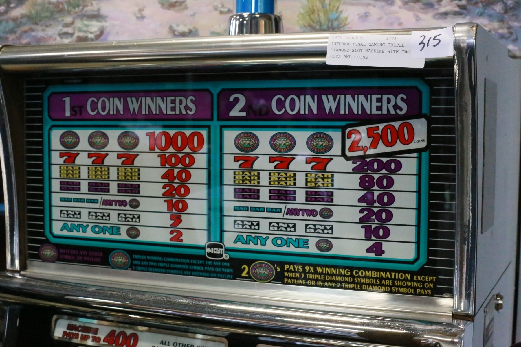 INTERNATIONAL GAMING TRIPLE DIAMOND SLOT MACHINE WITH TWO KEYS AND COINS