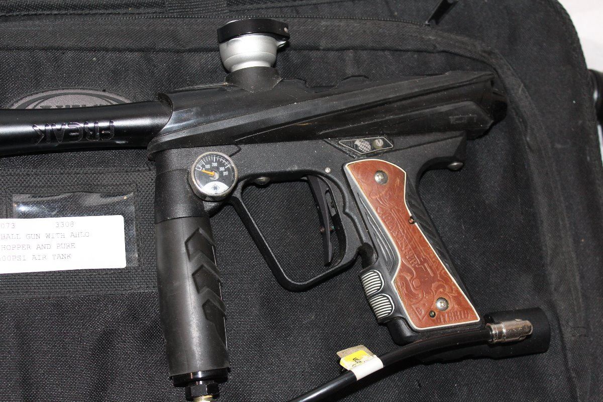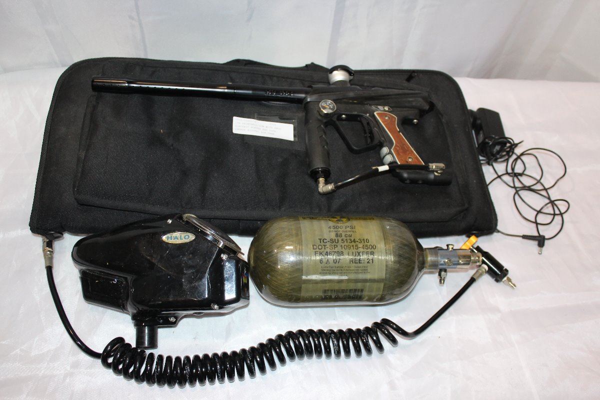 ION PAINTBALL ELECTRIC PAINTBALL GUN, WITH HALO ELECTRIC HOPPER, AND PURE ENERGY CARBON FIBRE 4500PSI TANK WITH CASE AND ACCESSORIES