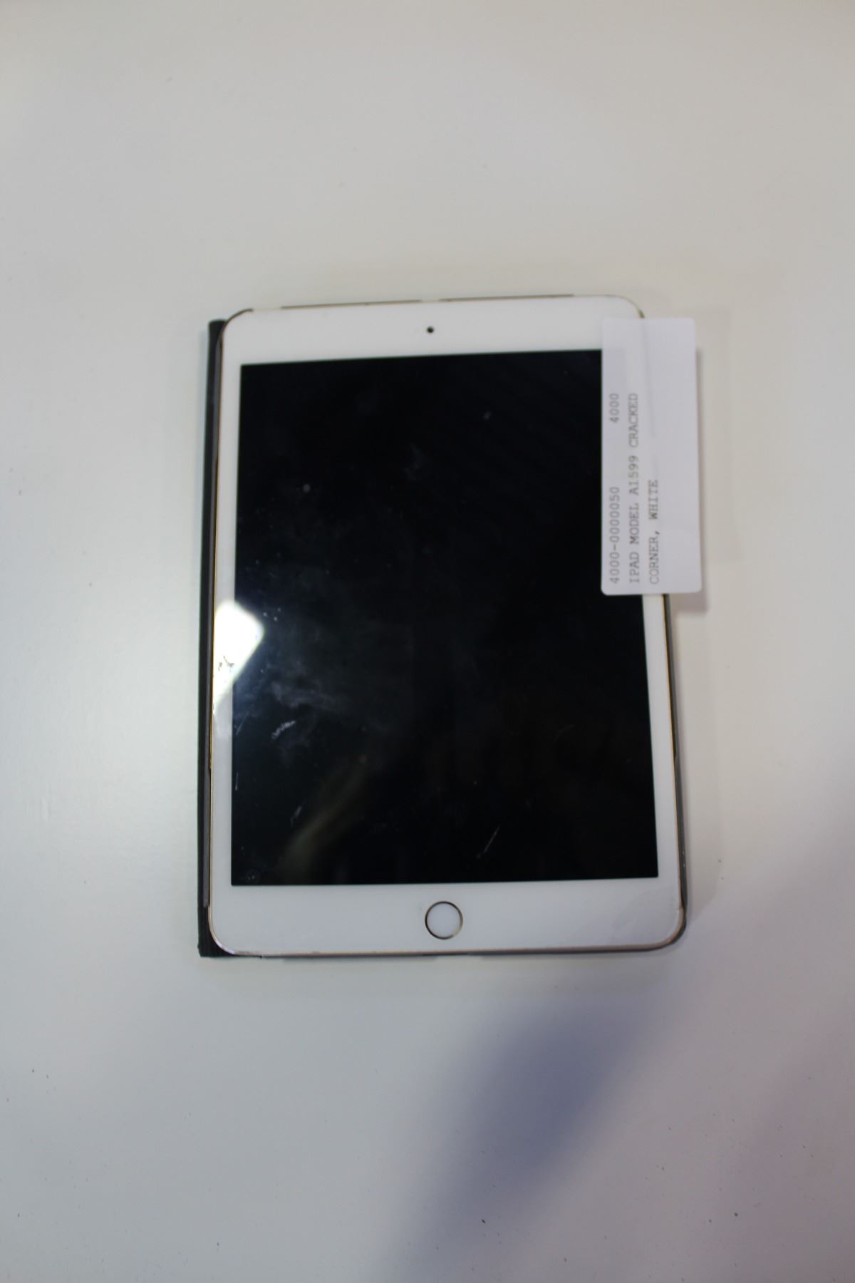 IPAD MODEL A1599 CRACKED CORNER, WHITE, PREVIEW STRONGLY RECOMMENDED, ALL ITEMS ARE FINAL SALE, BUYER BEWARE, ITEMS MAY BE FOR PARTS OR REPAIR