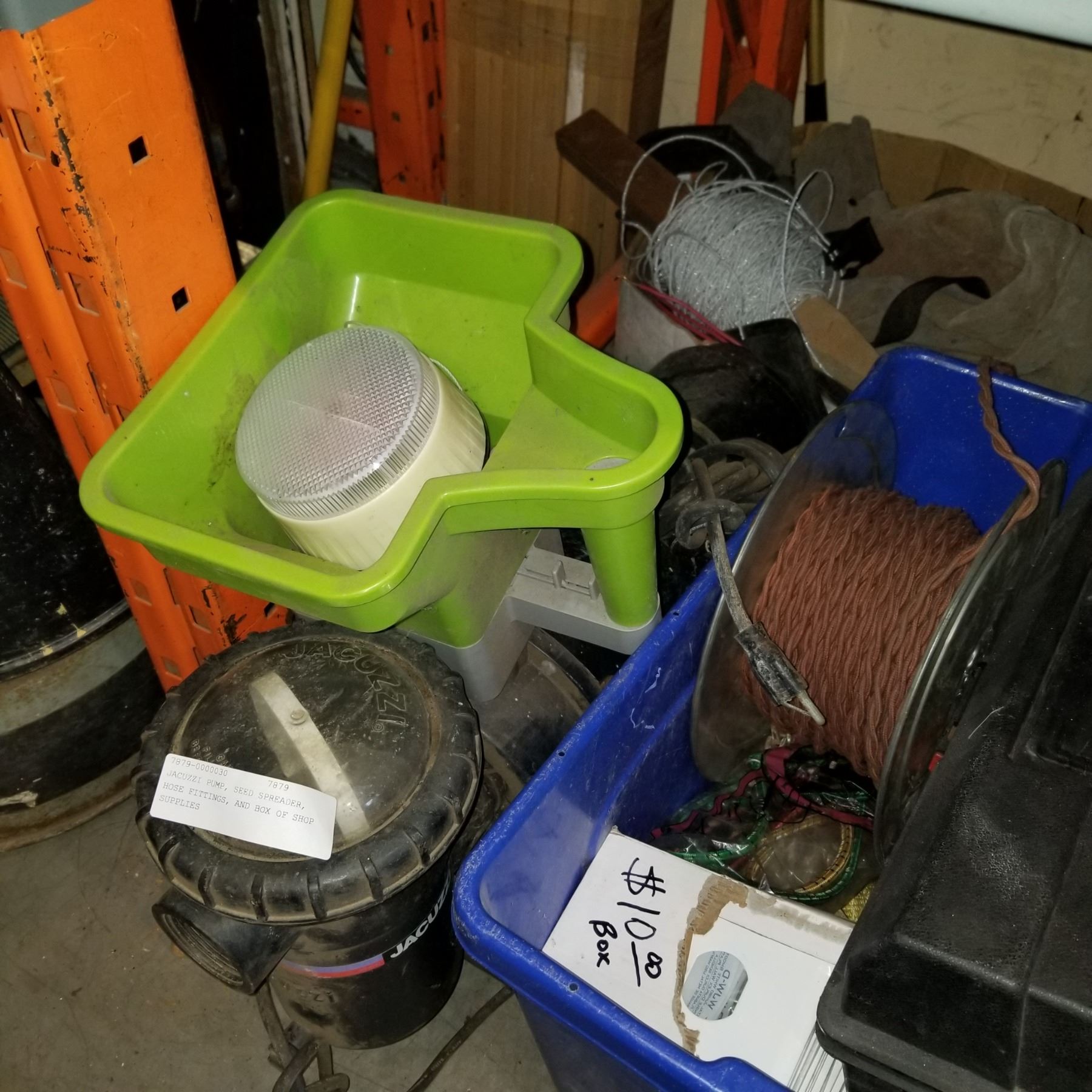 JACUZZI PUMP, SEED SPREADER, HOSE FITTINGS, AND BOX OF SHOP SUPPLIES