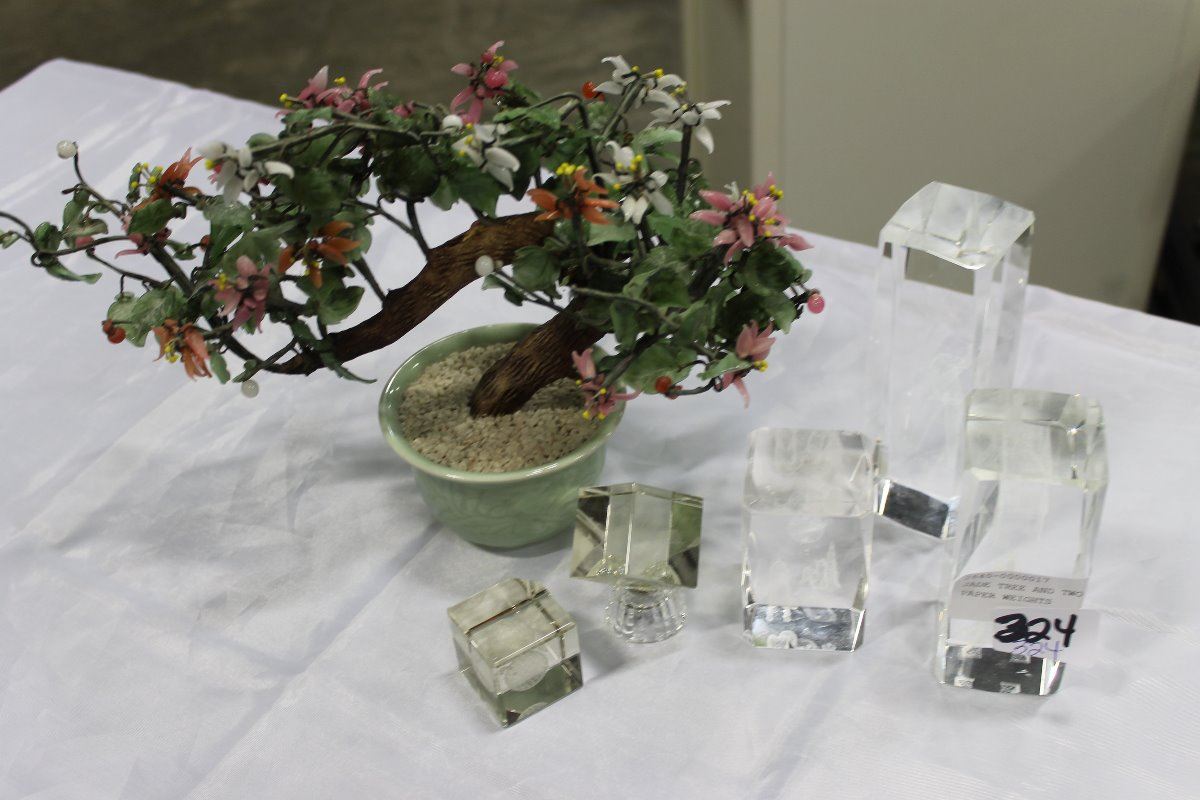 JADE TREE AND TWO CRYSTAL PAPER WEIGHTS
