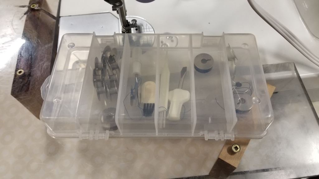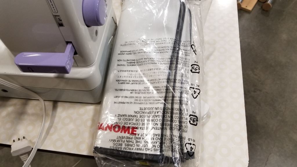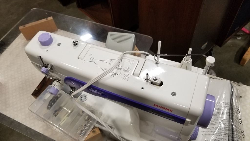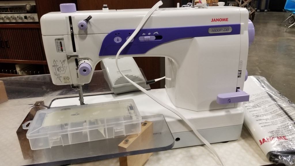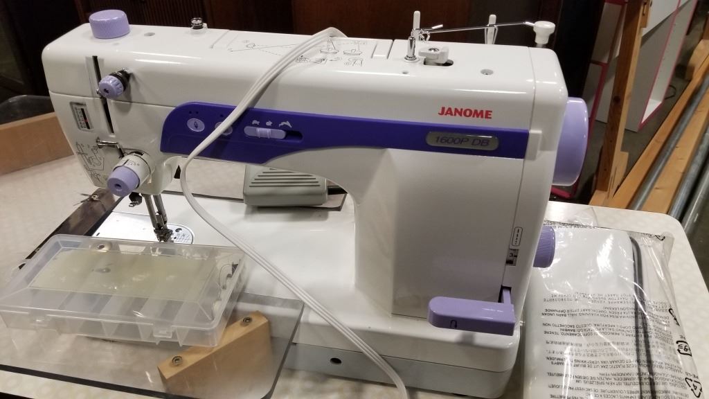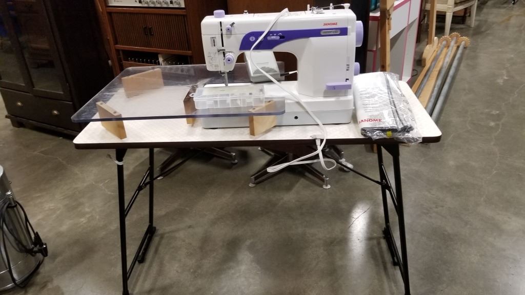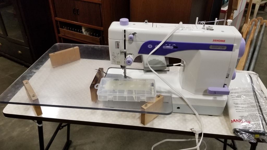 JANOME 1600P DB SEWING MACHINE WITH TABLE AND PLEXIGLASS EXTENSION PLATFORM