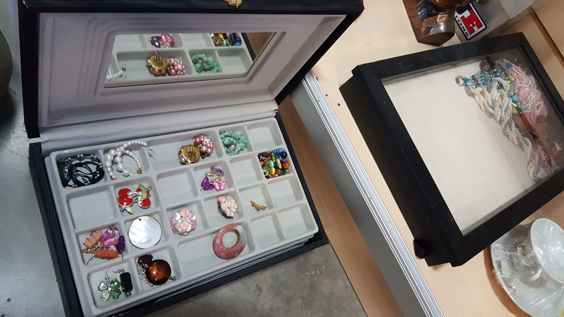 JEWELERY BOX WITH CONTENTS AND DISPLAY CASE WITH CONTENTS