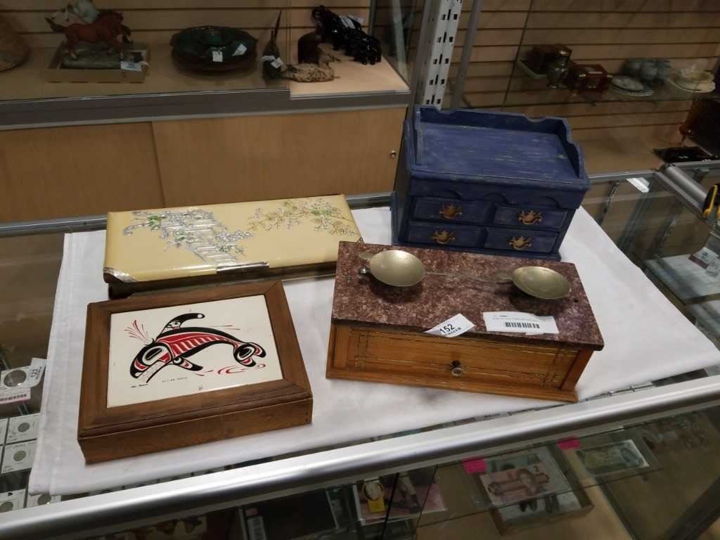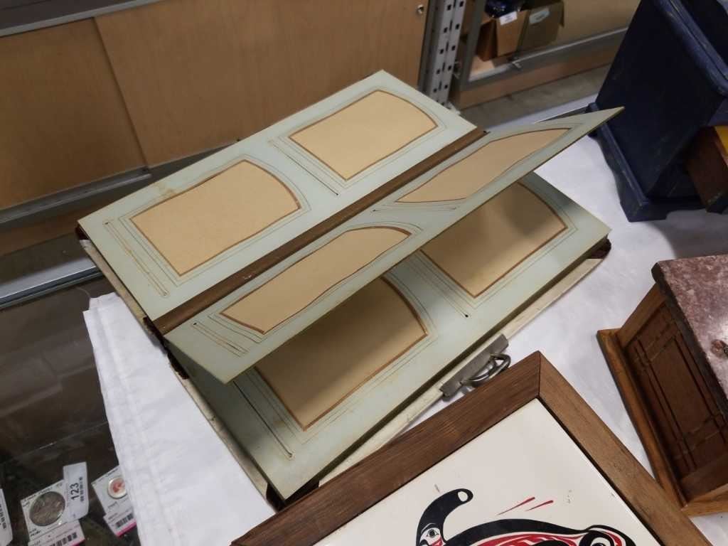 JEWELRY BOX, FIRST NATIONS BOX, VINTAGE SCALE AND VINTAGE PHOTO ALBUM