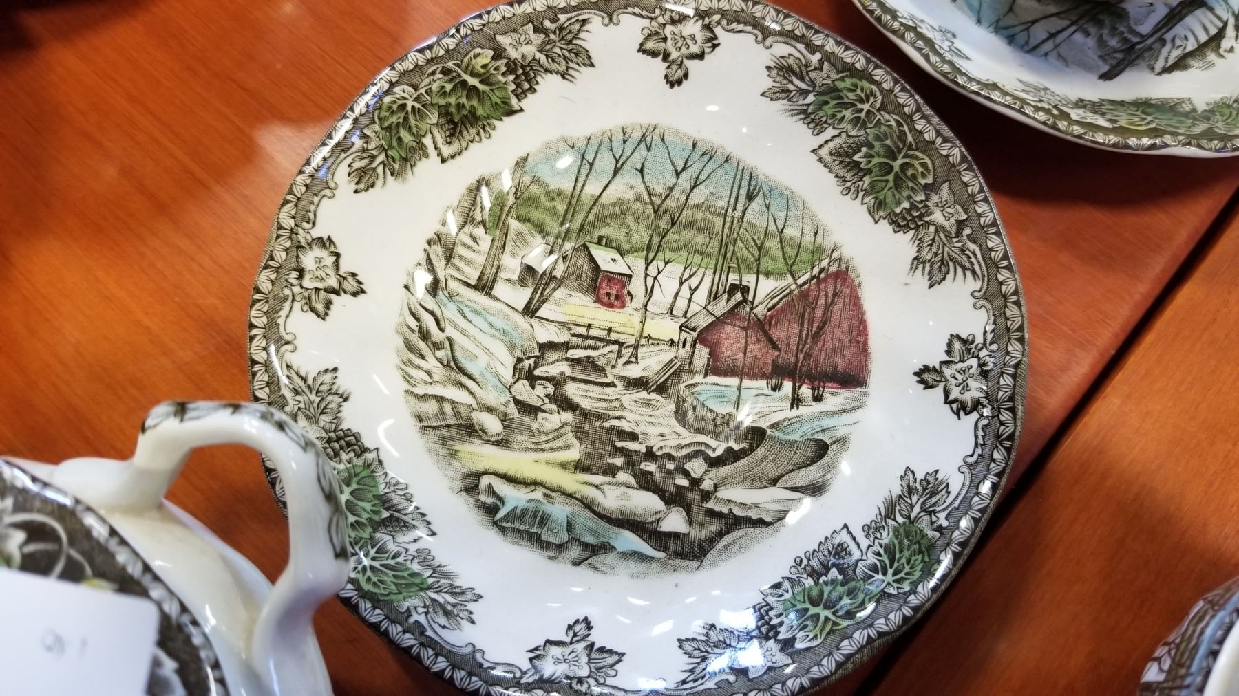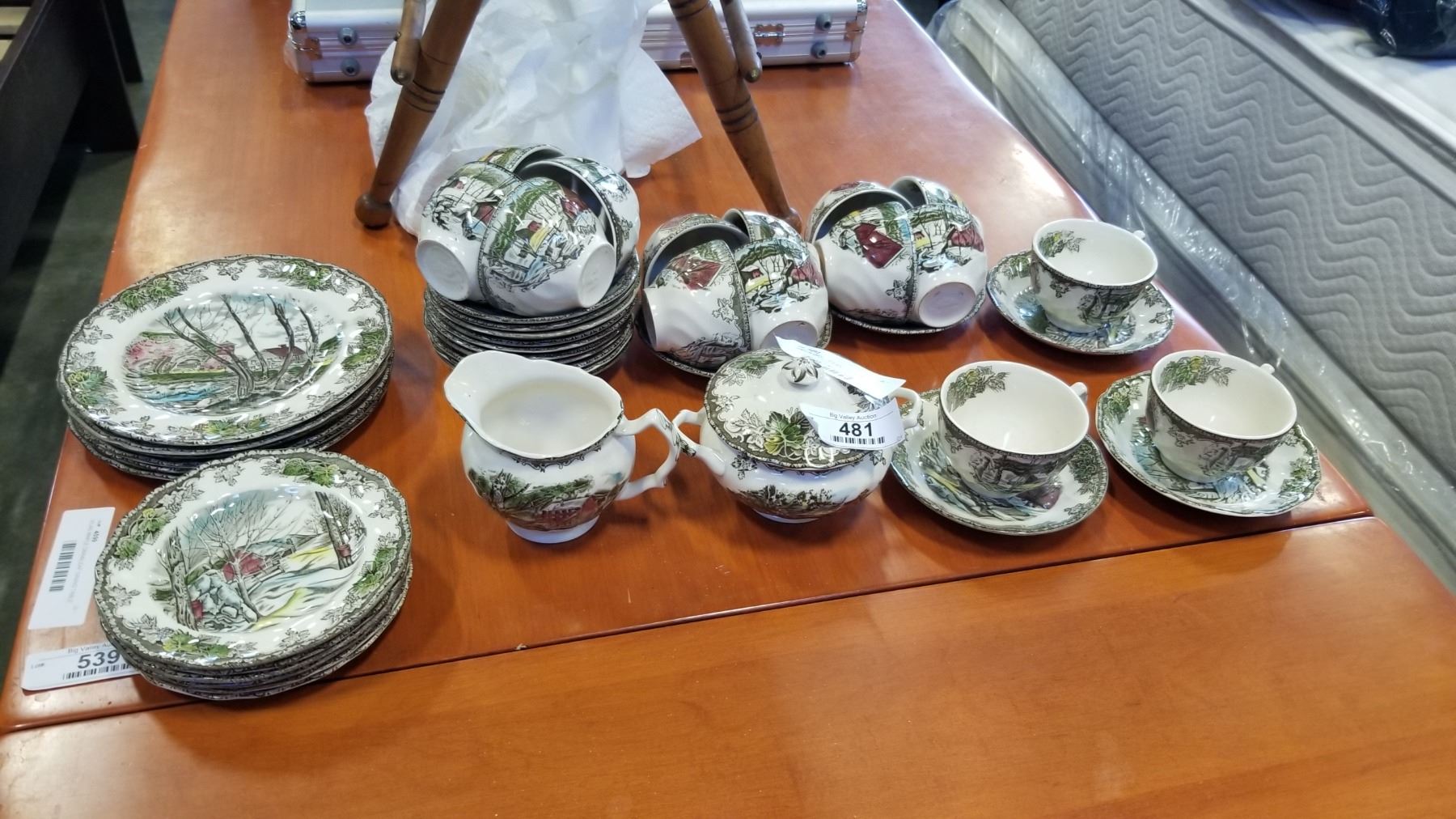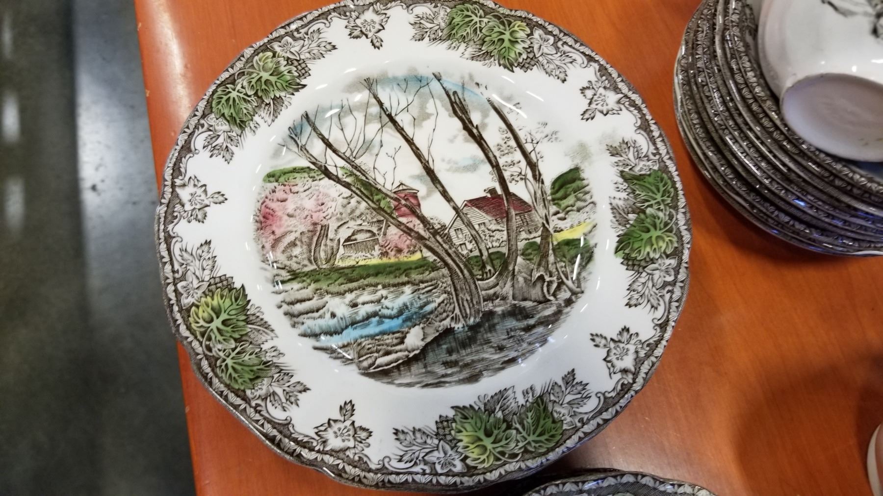 JOHNSON BROS FRIENDLY VILLAGE, TEACUPS SAUCERS, PLATES, CREAM AND SUGAR