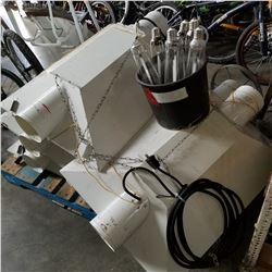 BOX OF SHOP SUPPLIES, SAFETY HARNESS, AIR MATTRESS, LIGHT, POOL COVER, AND METAL DUST PANS