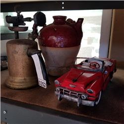 ANTIQUE BLOW TORCH POTTERY VASE AND METAL CAR