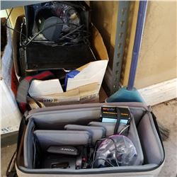 BOX OF VINTAGE CAMERAS, GEAR, AND TRANSISTOR RADIOS