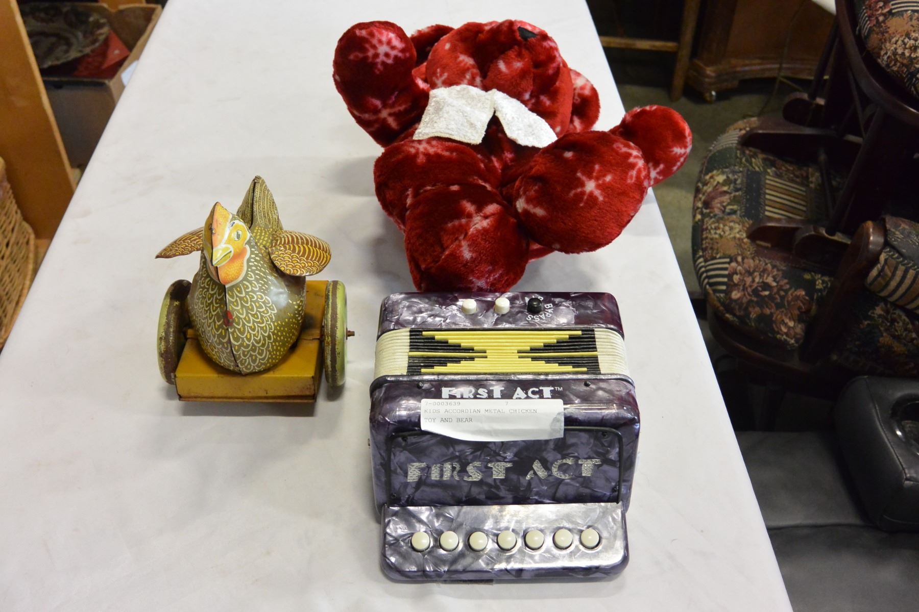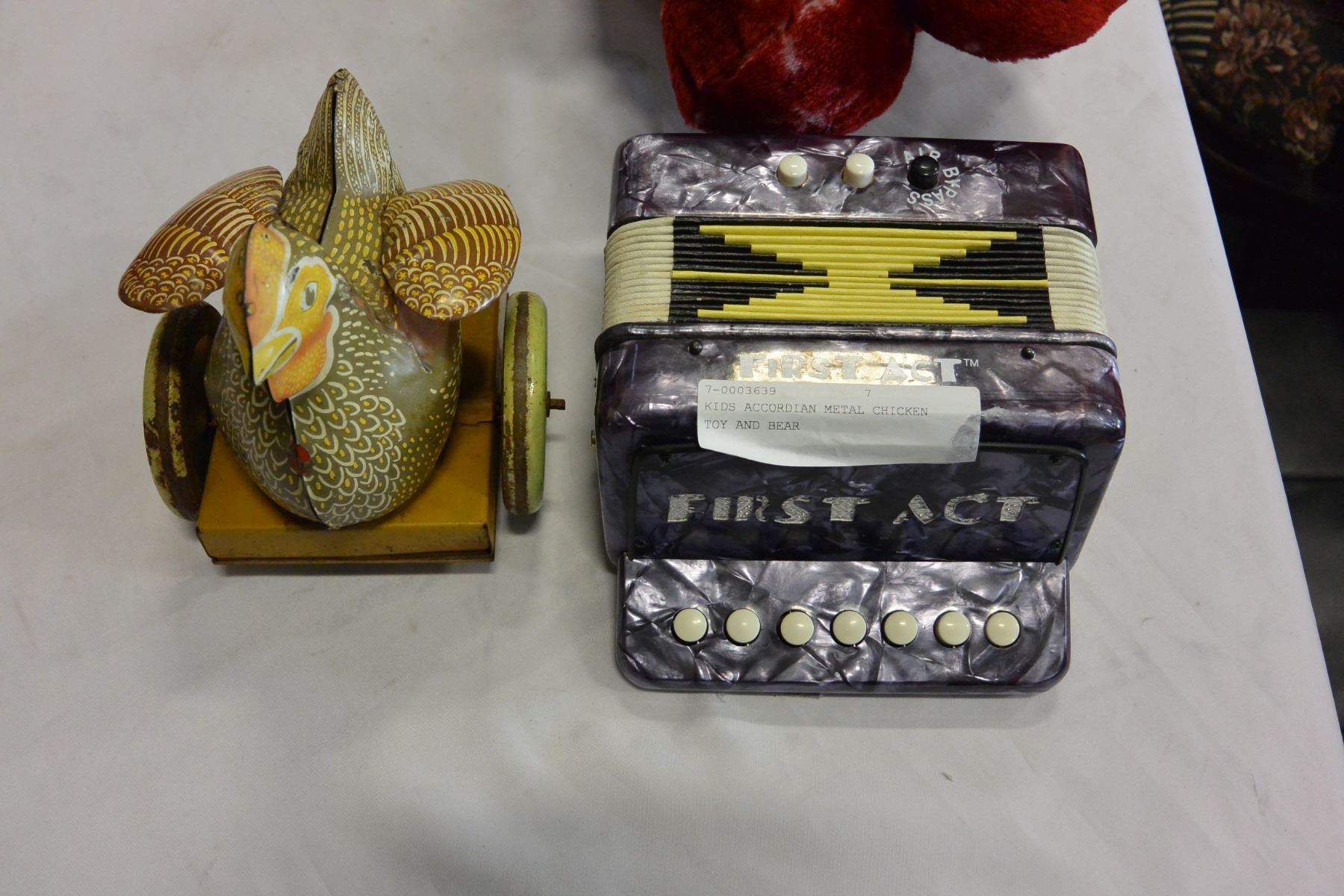 KIDS ACCORDIAN METAL CHICKEN TOY AND BEAR