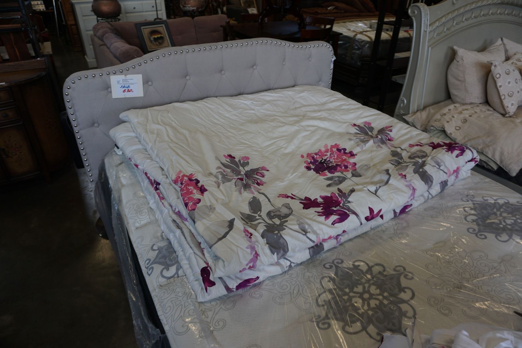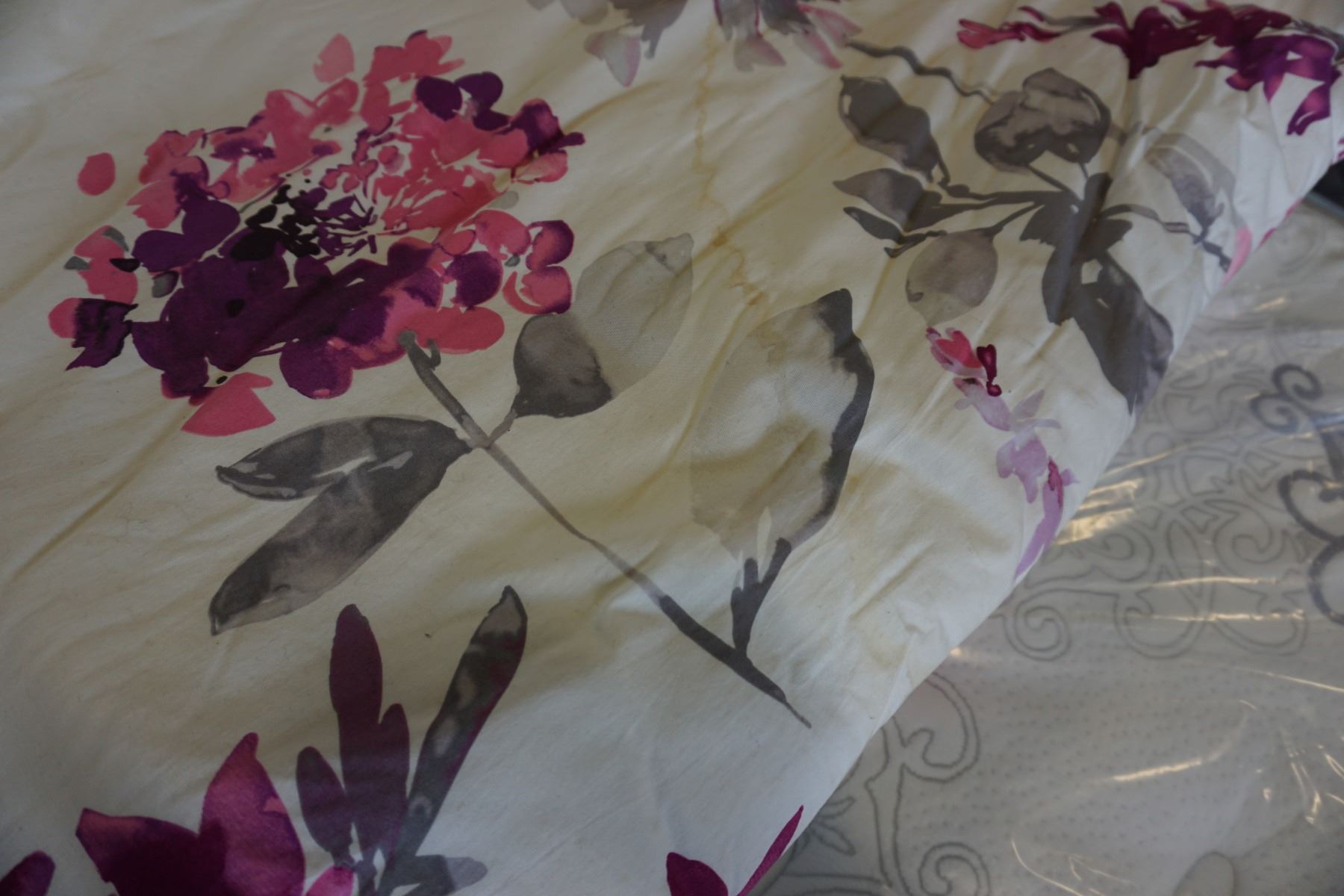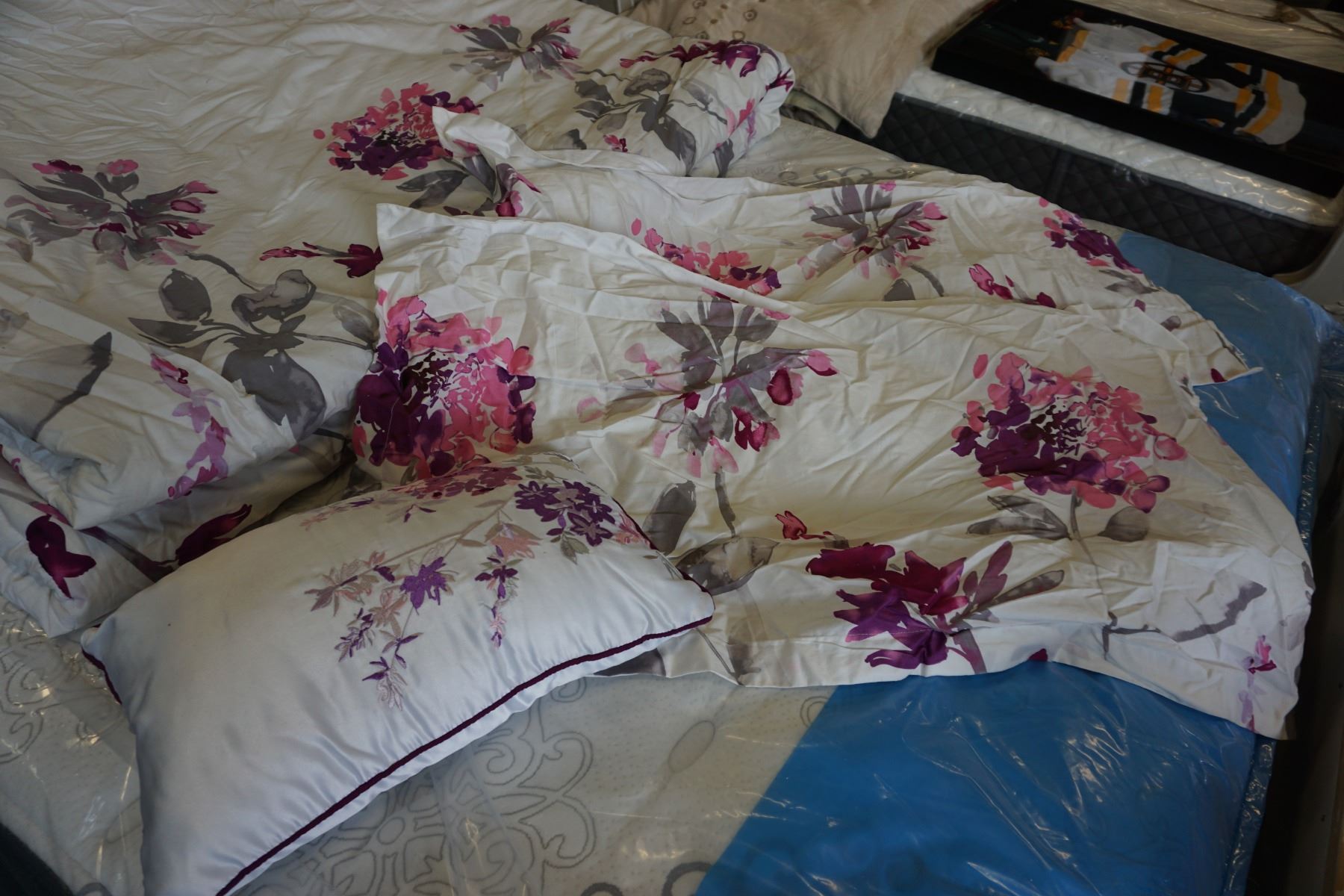 KINGSIZE DUVET AND 2 KINGSIZE PILLOW SHAMS, 1 ACCENT PILLOW, VISIBLE WATER MARTKS, USED IN SHOWROOM