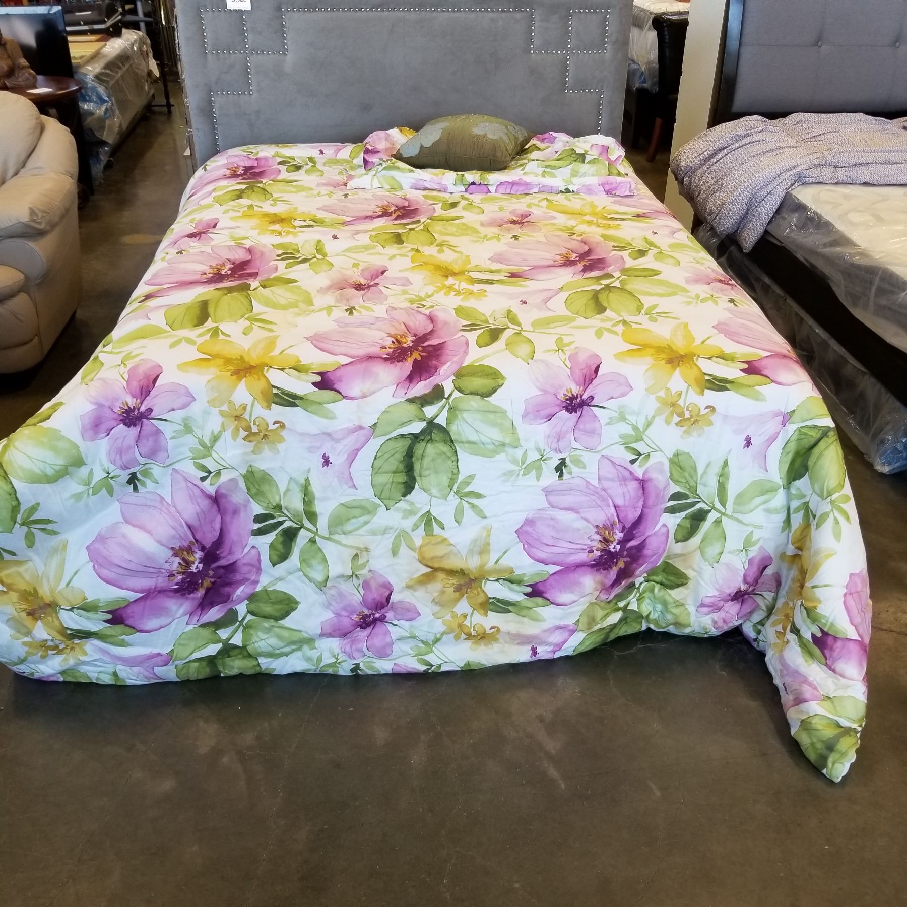 KINGSIZE FLORAL DUVET AND 2 KINGSIZE SHAMS, 1 ACCENT PILLOW, VISIBLE WATERMARKS, USED IN SHOWROOM, N