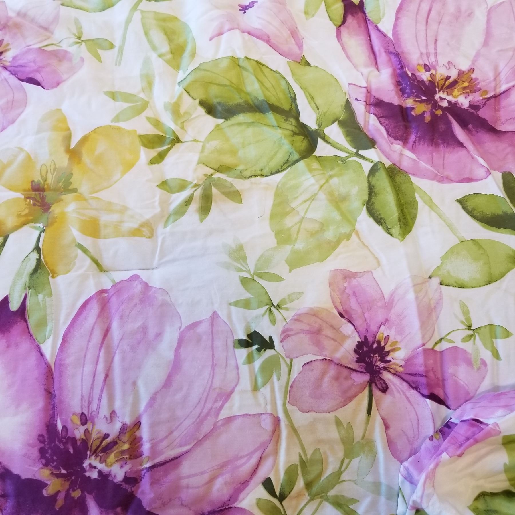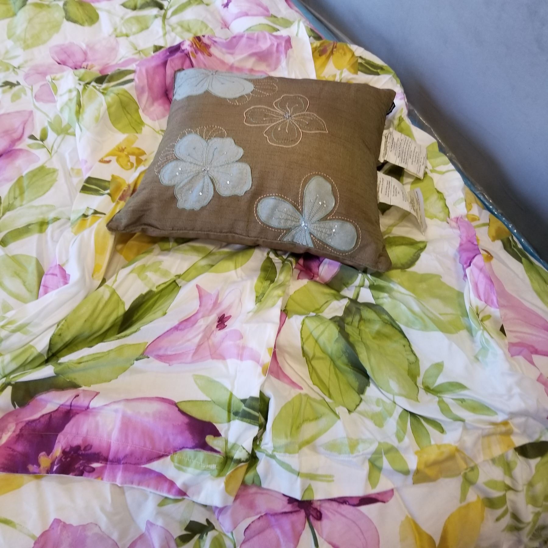 KINGSIZE FLORAL DUVET AND 2 KINGSIZE SHAMS, 1 ACCENT PILLOW, VISIBLE WATERMARKS, USED IN SHOWROOM, NEEDS CLEANING