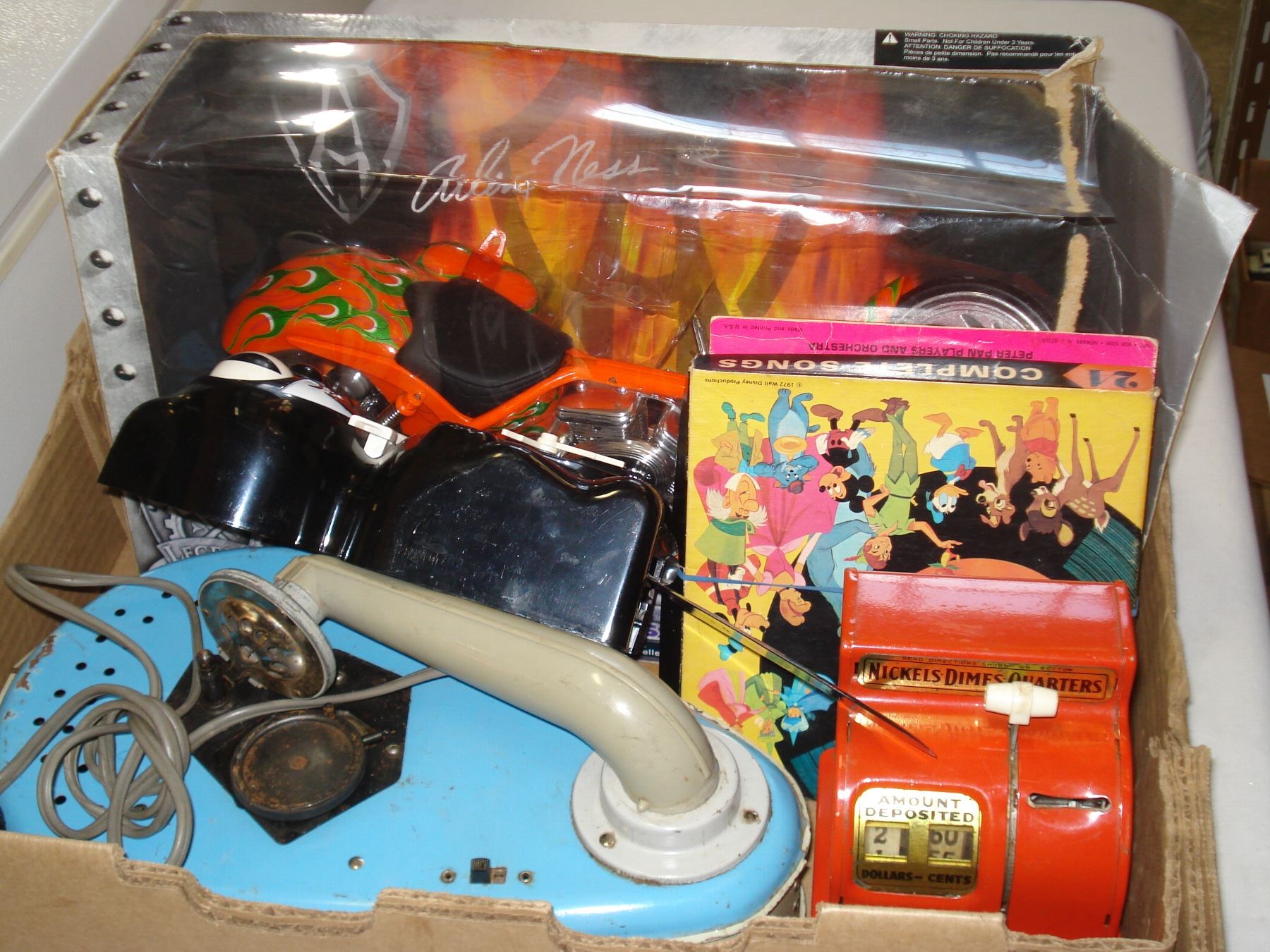 KIT CAT CLOCK, TOY BANK, PHONOGRAPH AND MOTORCYCLE TOY