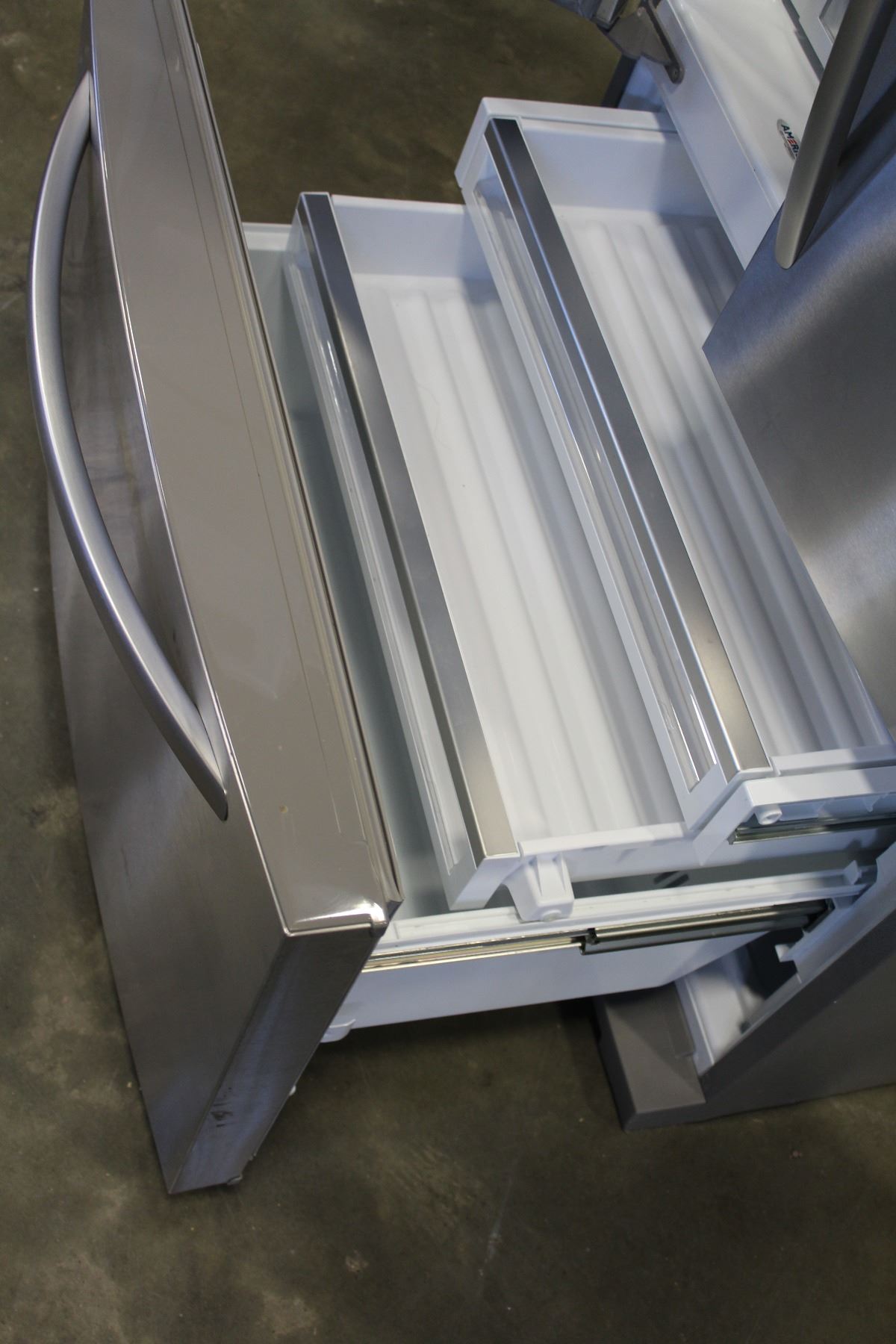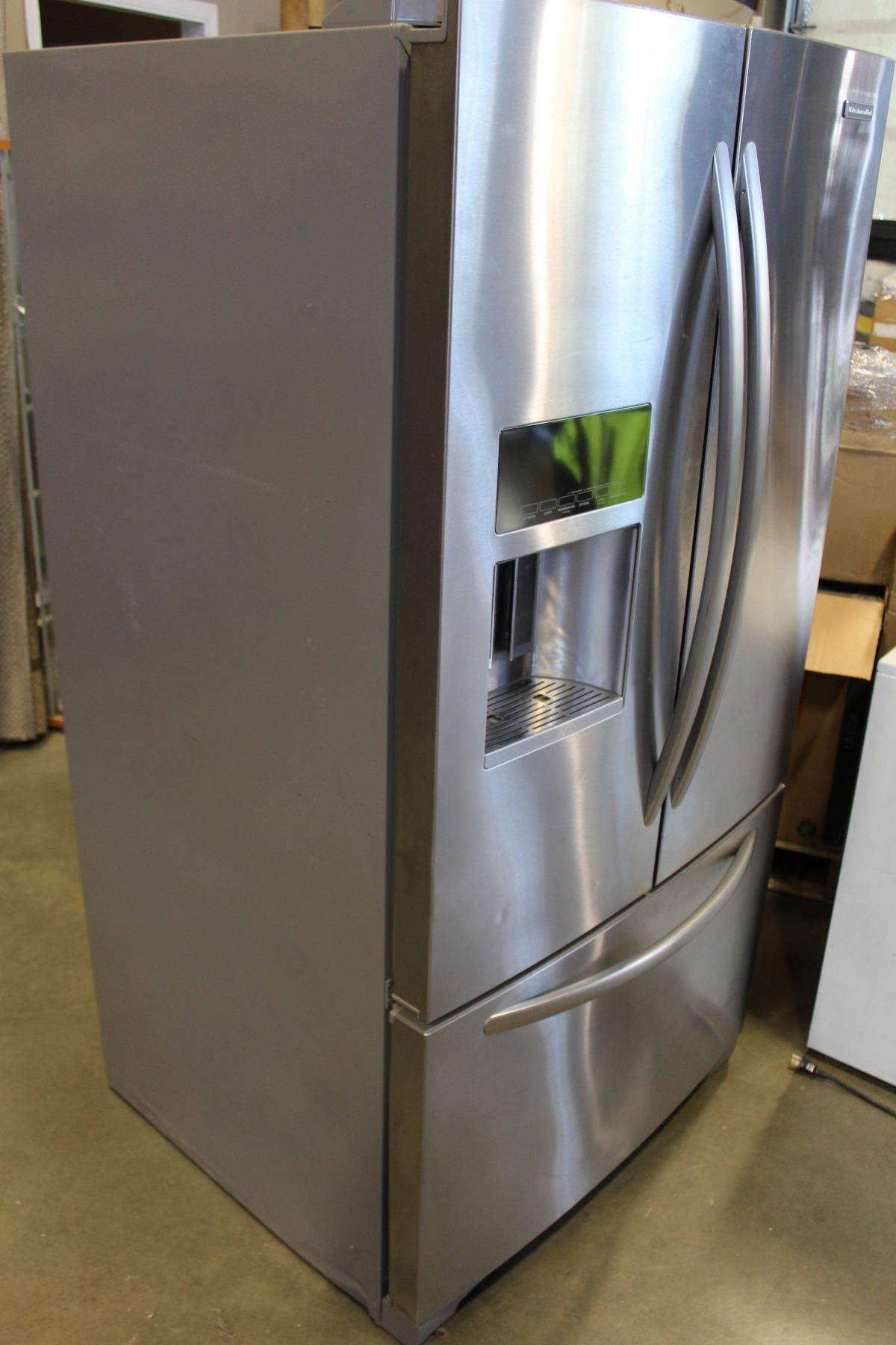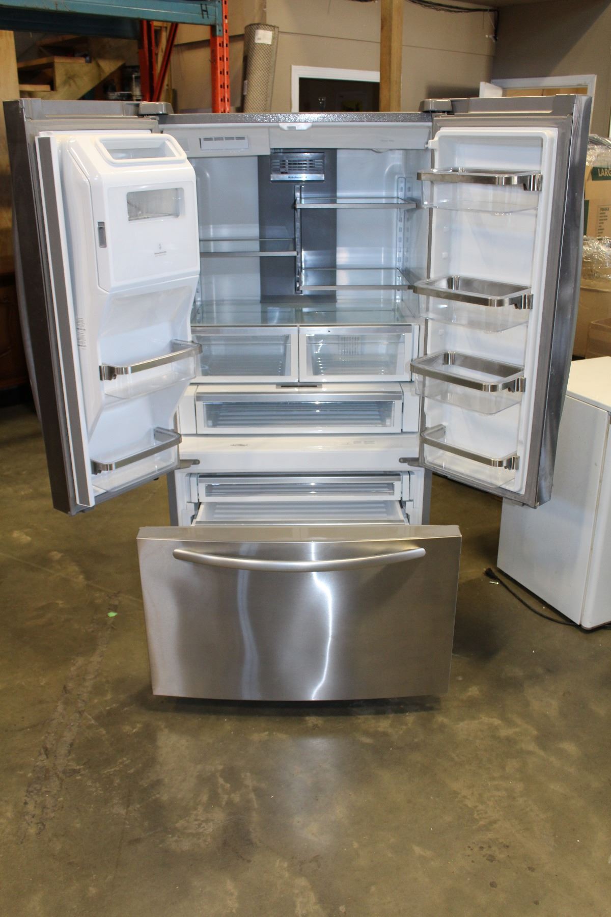 KITCHEN AID STAINLESS DOUBLE DOOR FRIDGE WITH WATER AND ICE AND SLIDE OUT BOTTOM FREEZER WORKING ORD