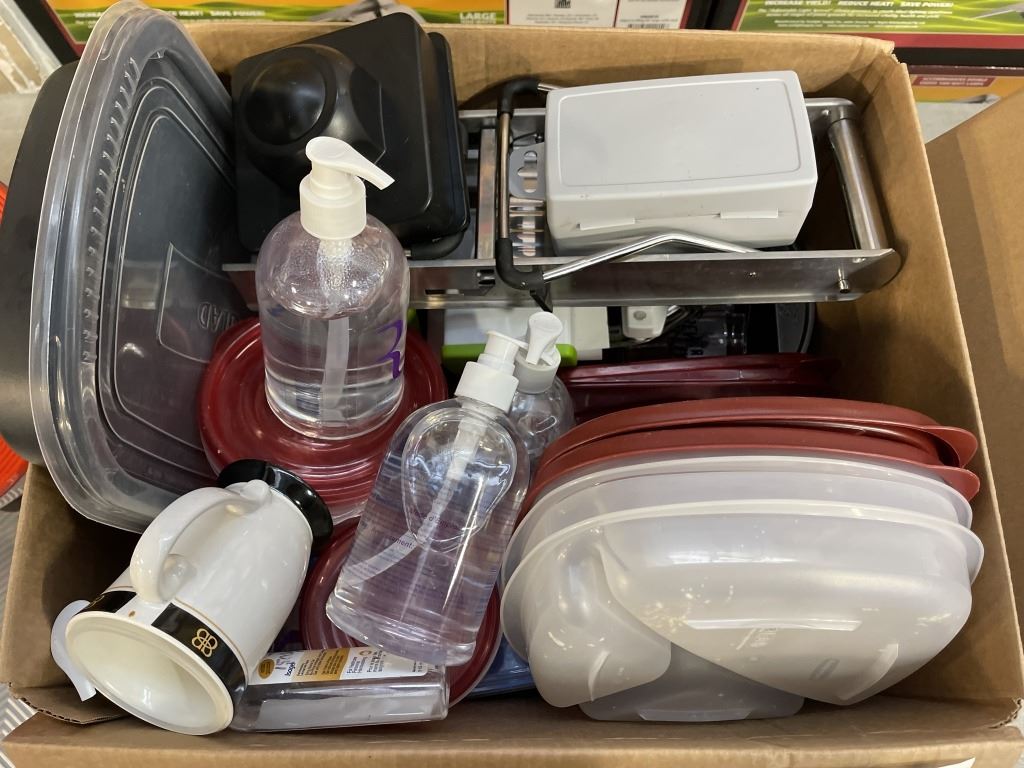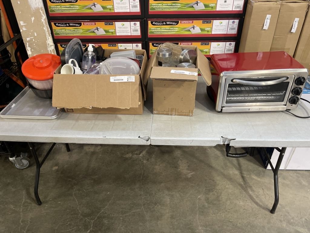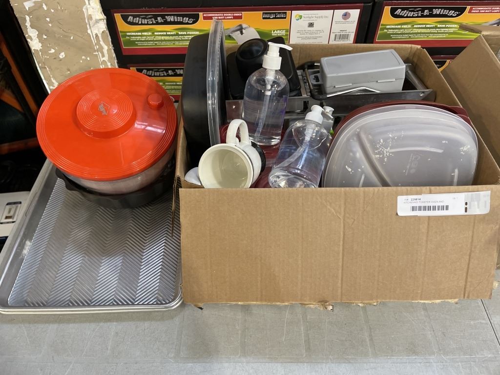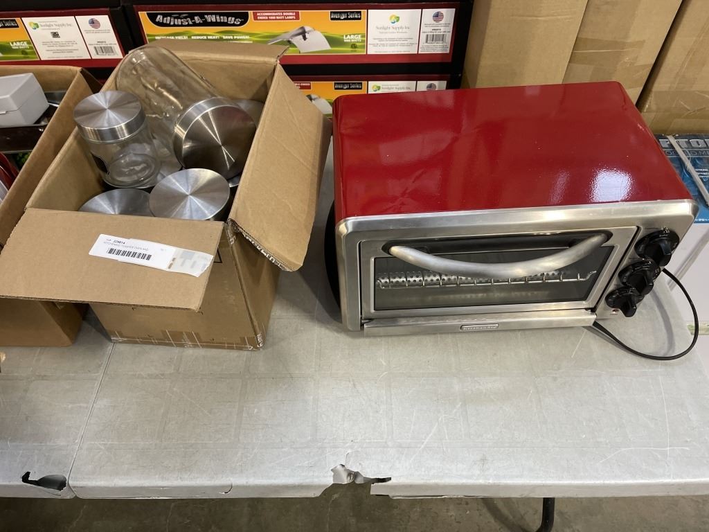KITCHENAID TOASTER OVEN AND CANNISTERS WITH BOX OF KITCHEN SUPPLIES, COOKIE SHEETS AND MIXING BOWLS