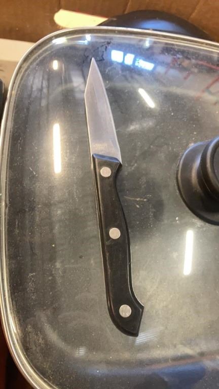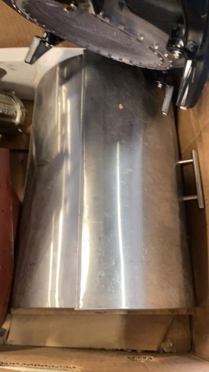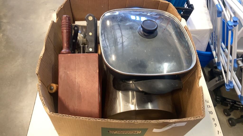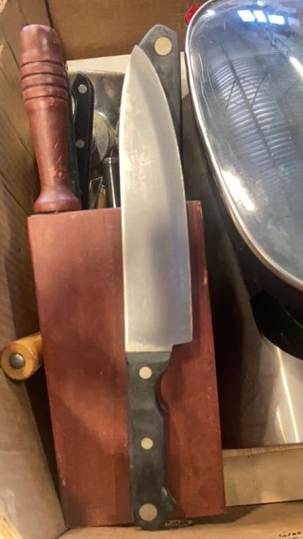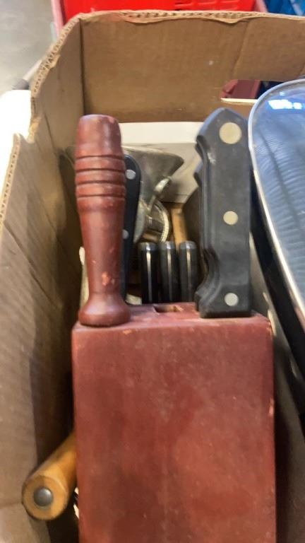KNIVES, KNIFE BLOCK, MEAT GRINDER, BREAD BOX AND ELECTRIC COOKER