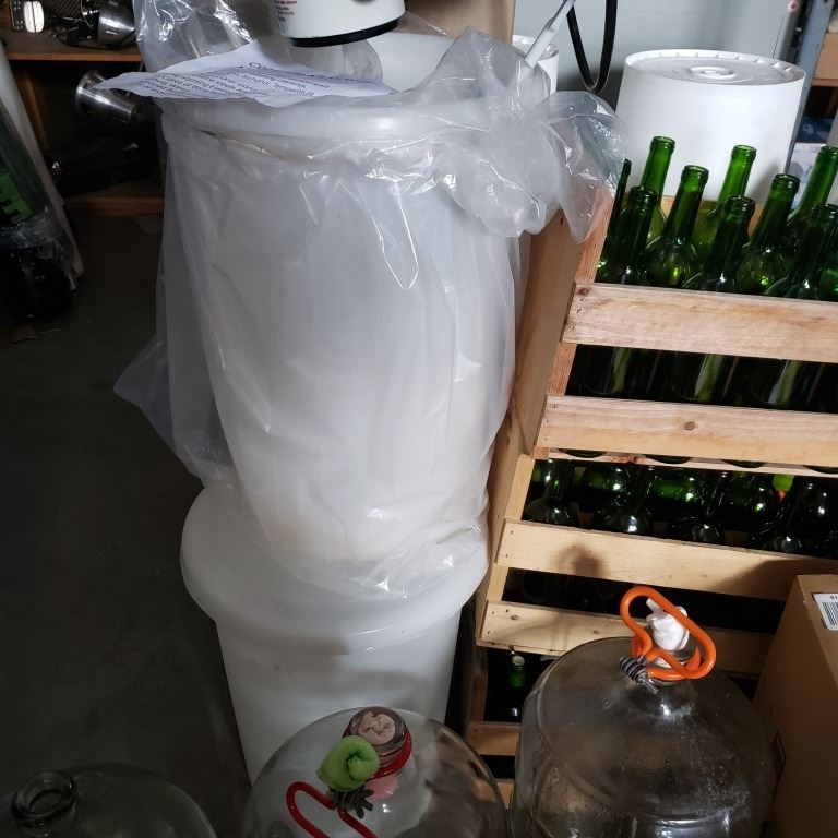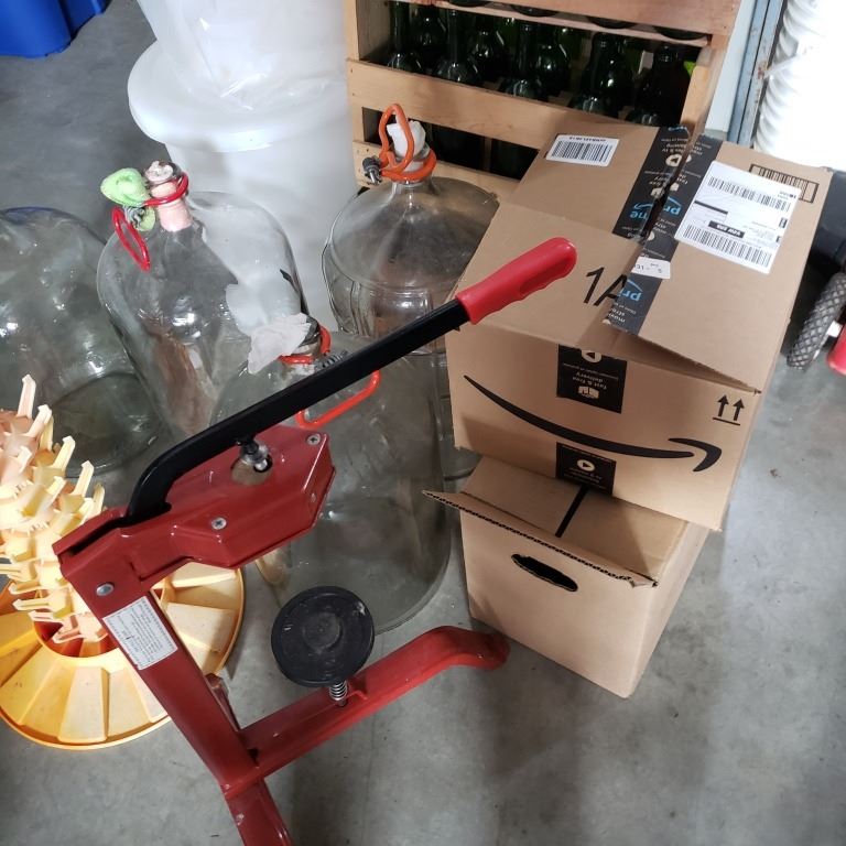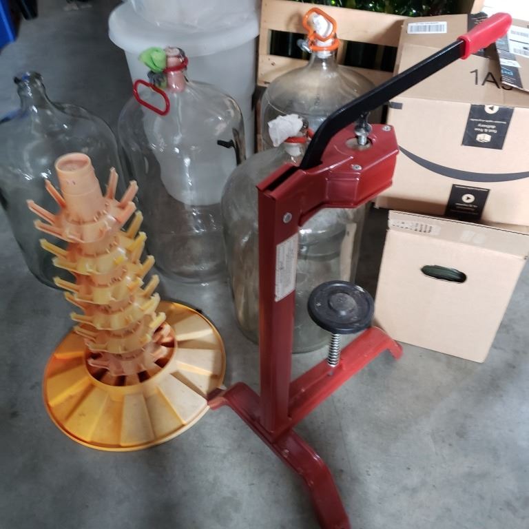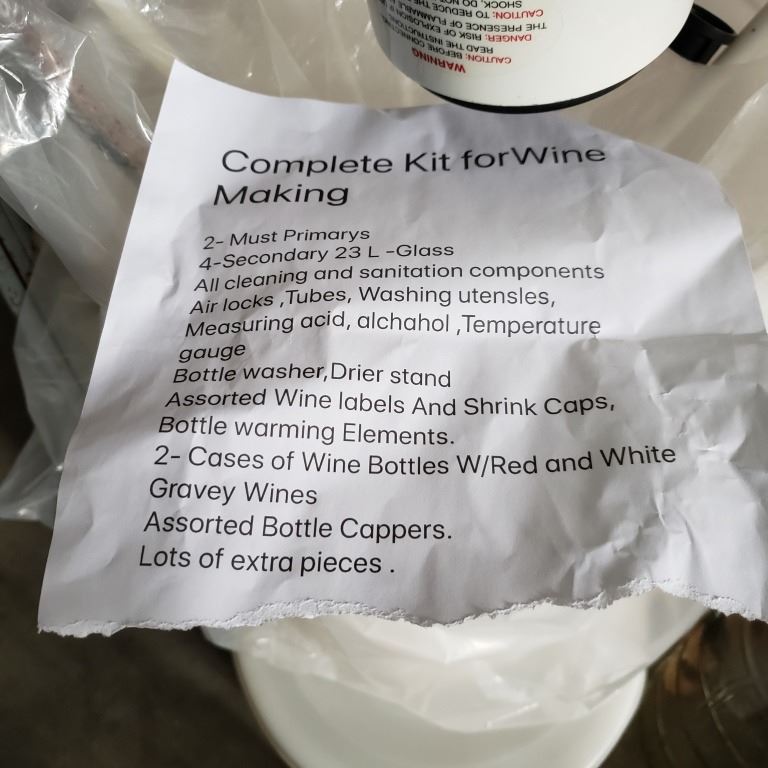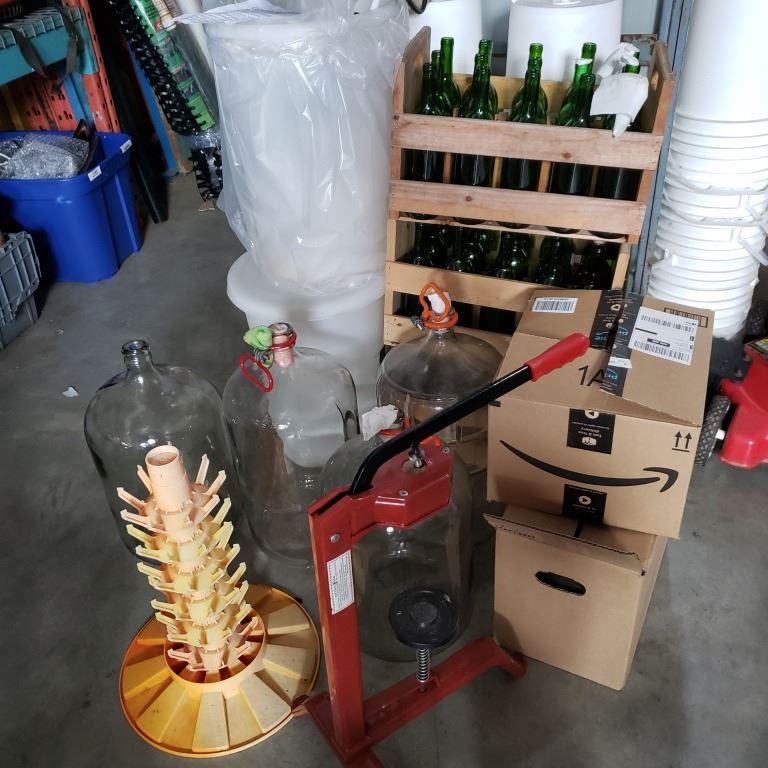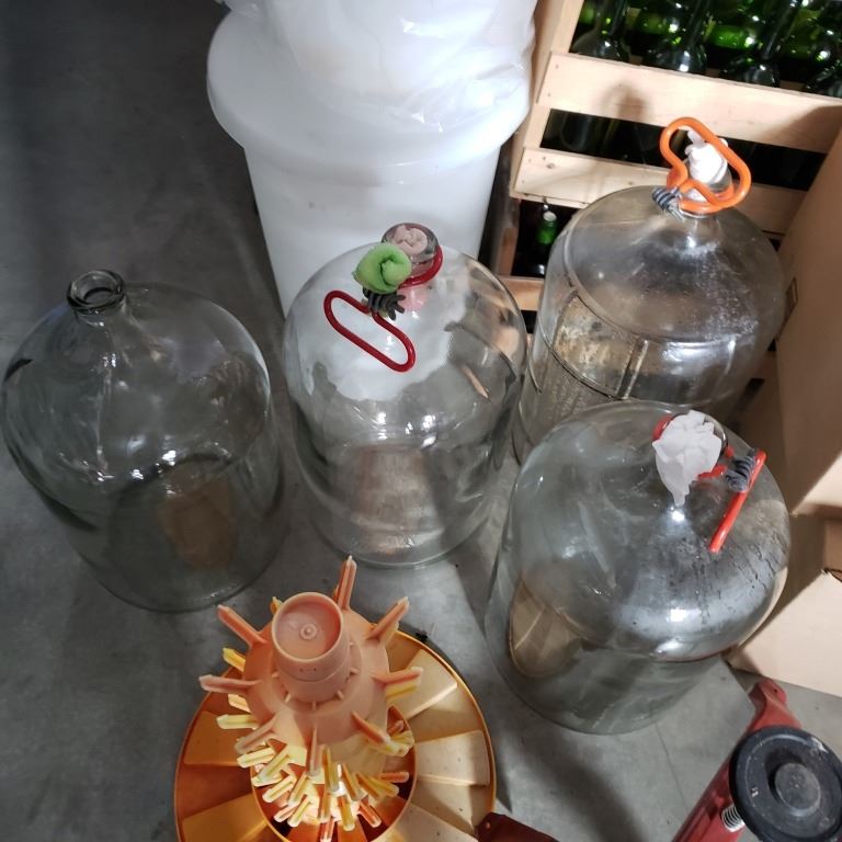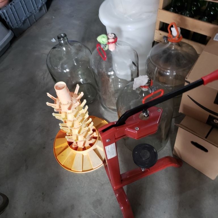 Kit for wine making: 4 glass carboys, 2 buckets, 2 cases of bottles, corker and more