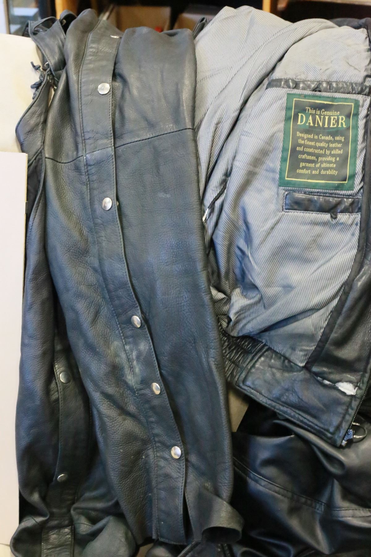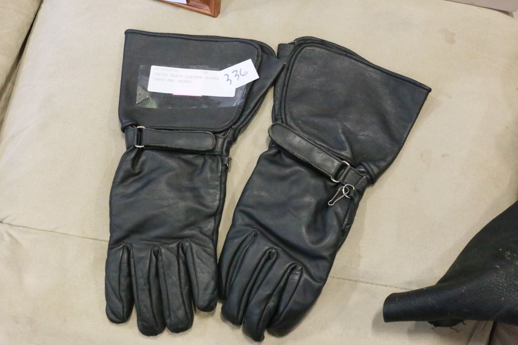 LADIES BLACK LEATHER GLOVES CHAPS AND JACKET
