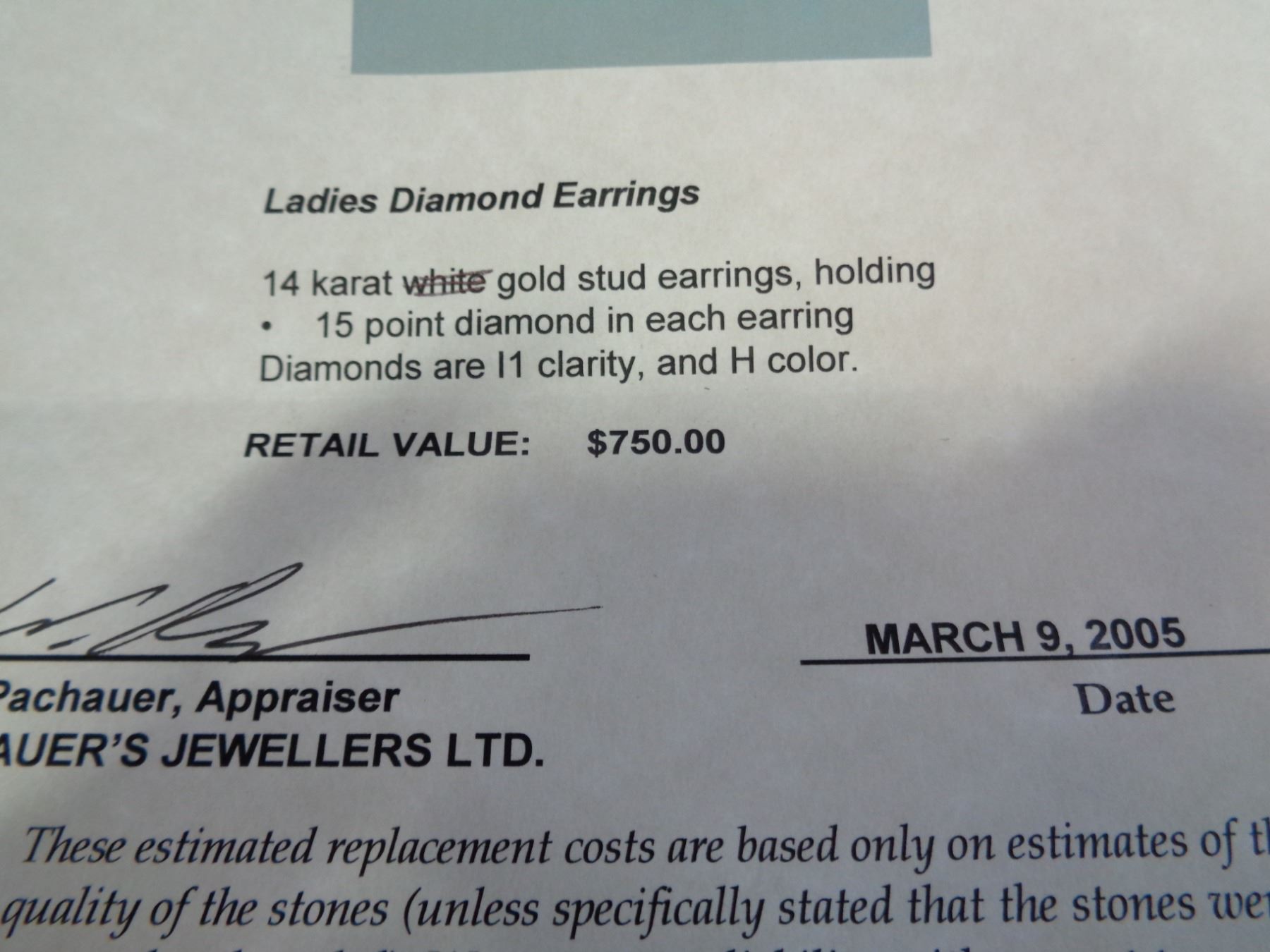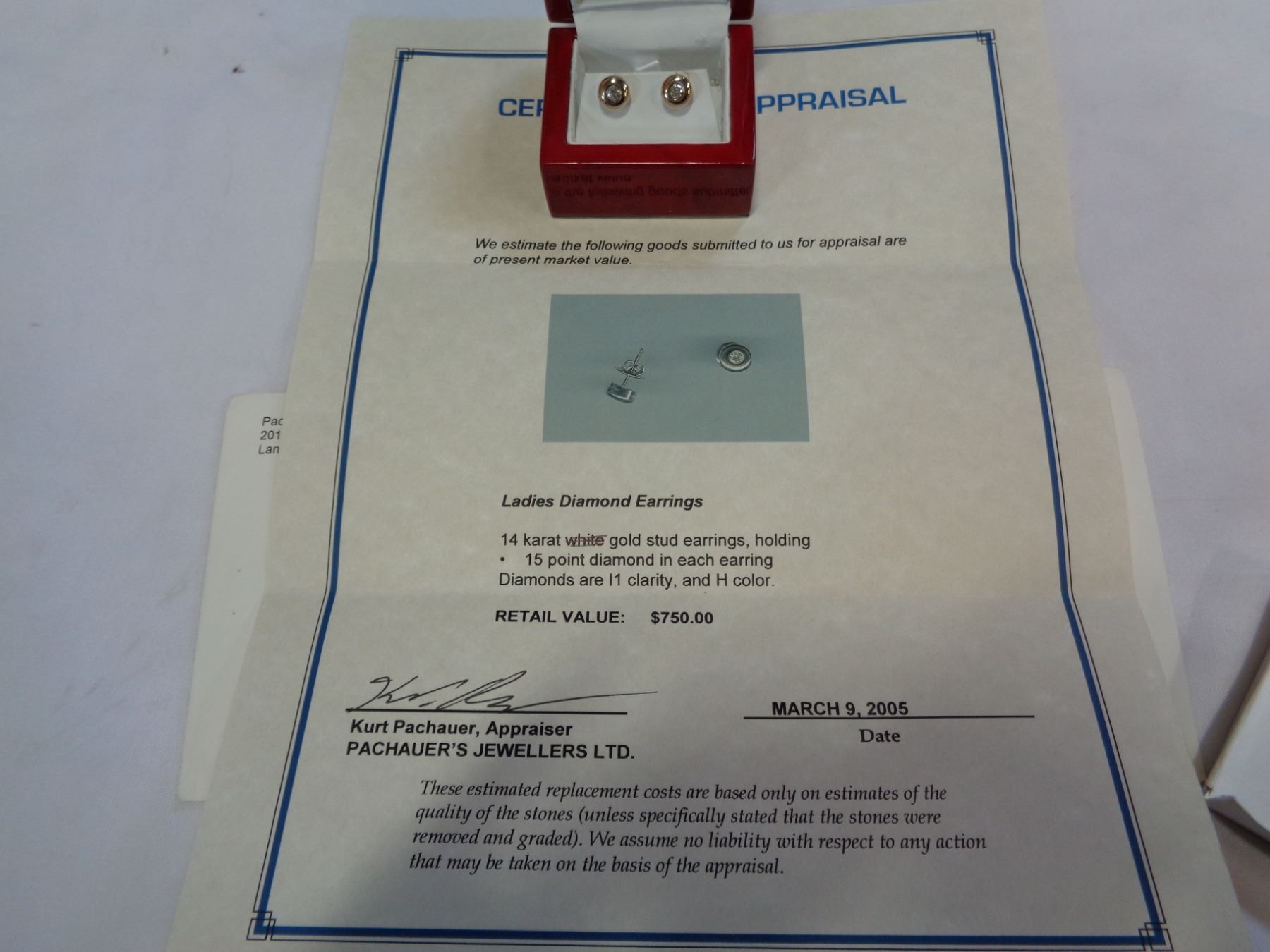 LADIES DIAMOND EARRINGS 14K GOLD STUD W/ APPRAISAL $750