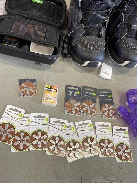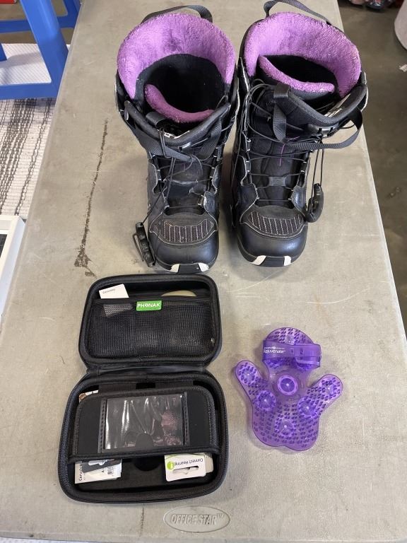LADIES SIZE 8 SALOMON SNOWBOARDING BOOTS WITH HEARING AID AND HAND MASSAGER