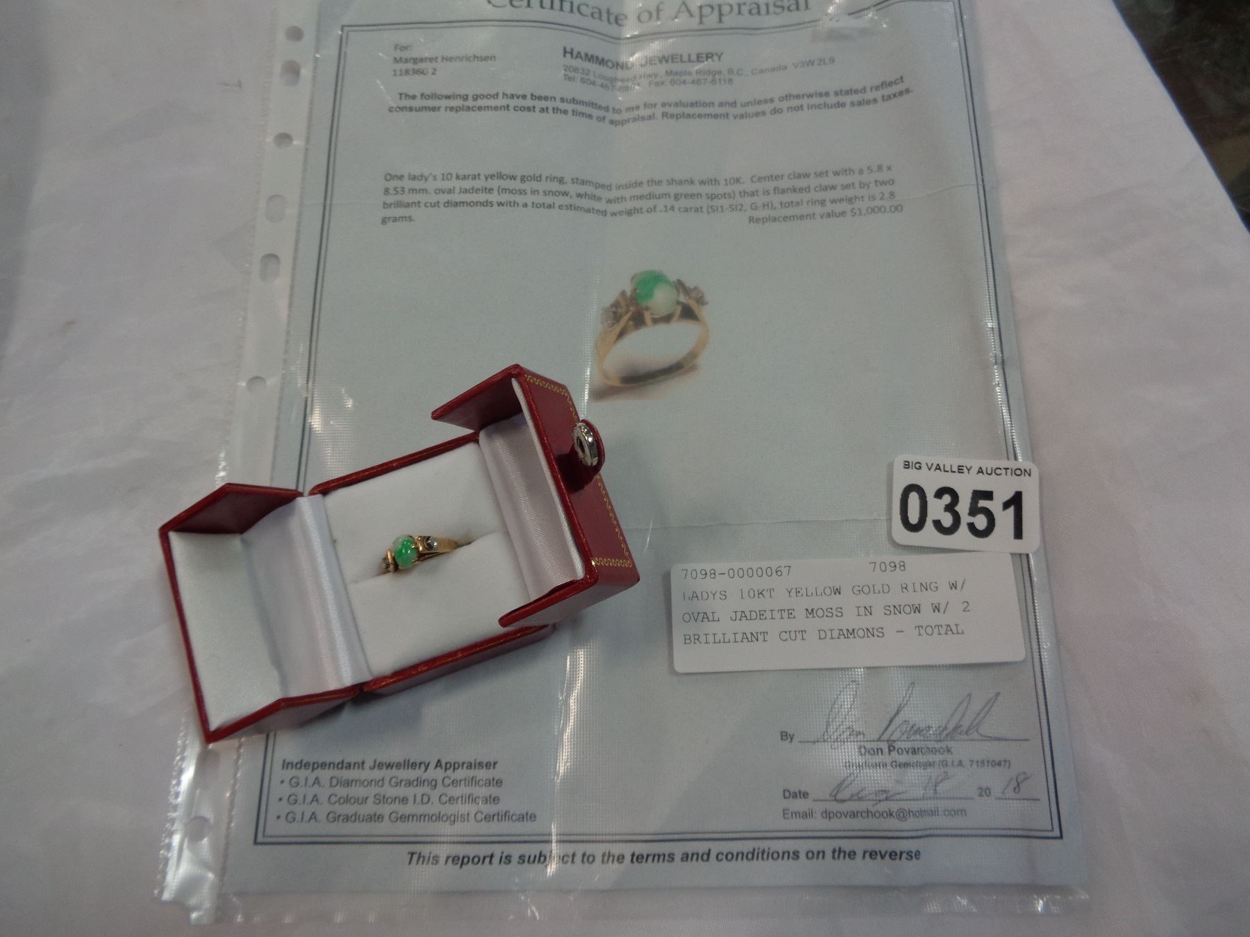 LADYS 10KT YELLOW GOLD RING W/ OVAL JADEITE MOSS IN SNOW W/ 2 BRILLIANT CUT DIAMONS - TOTAL WEIGHT 2.8GRAMS W/ CERT