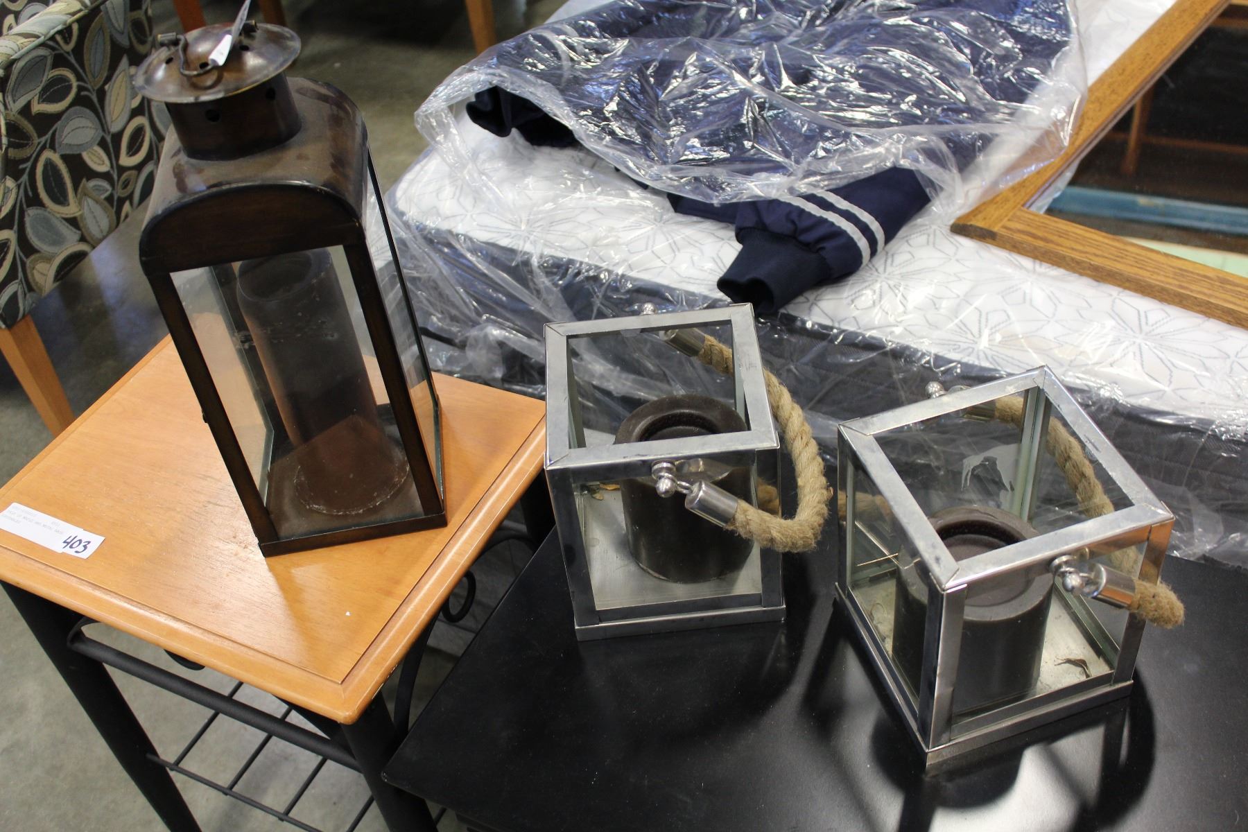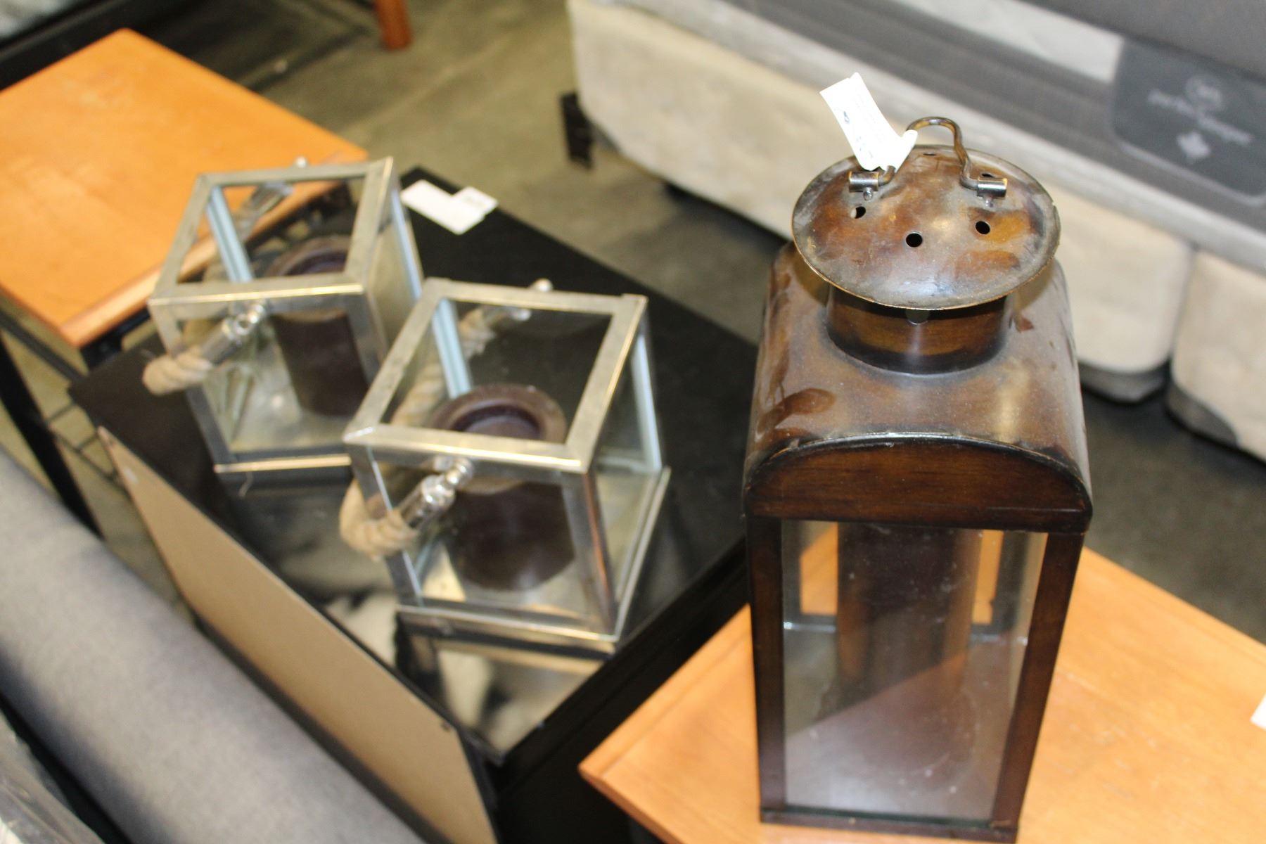 LANTERN AND TWO ROPE HANDLED CANDLESTANDS