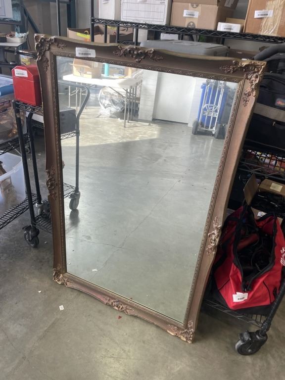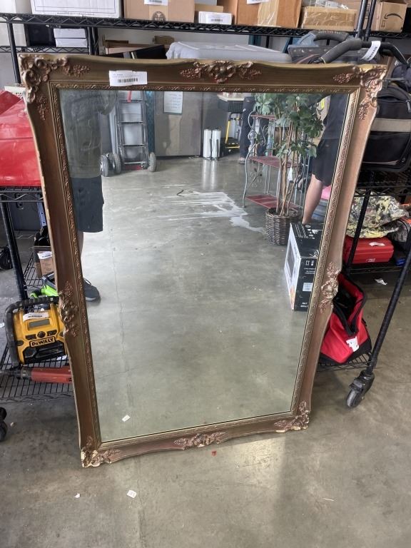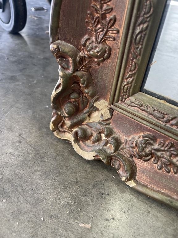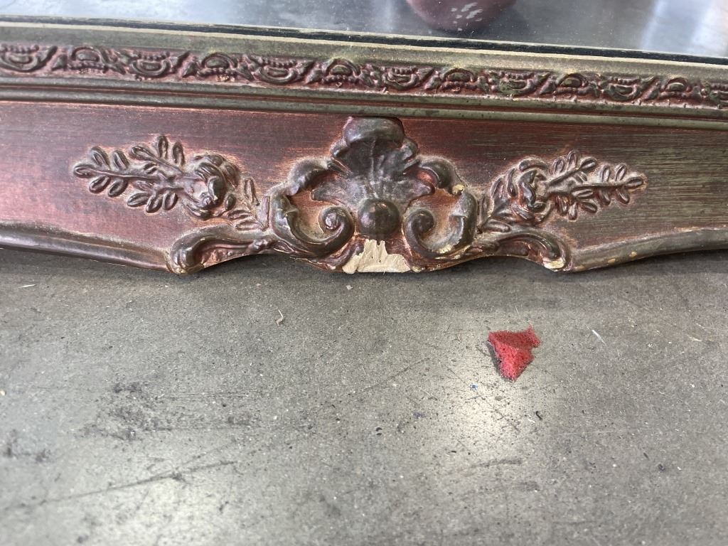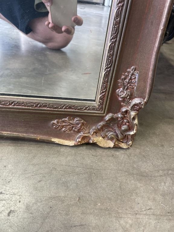 LARGE ANTIQUE GUILT FRAMED MIRROR, SOME DAMAGE, 53 X 36 INCH