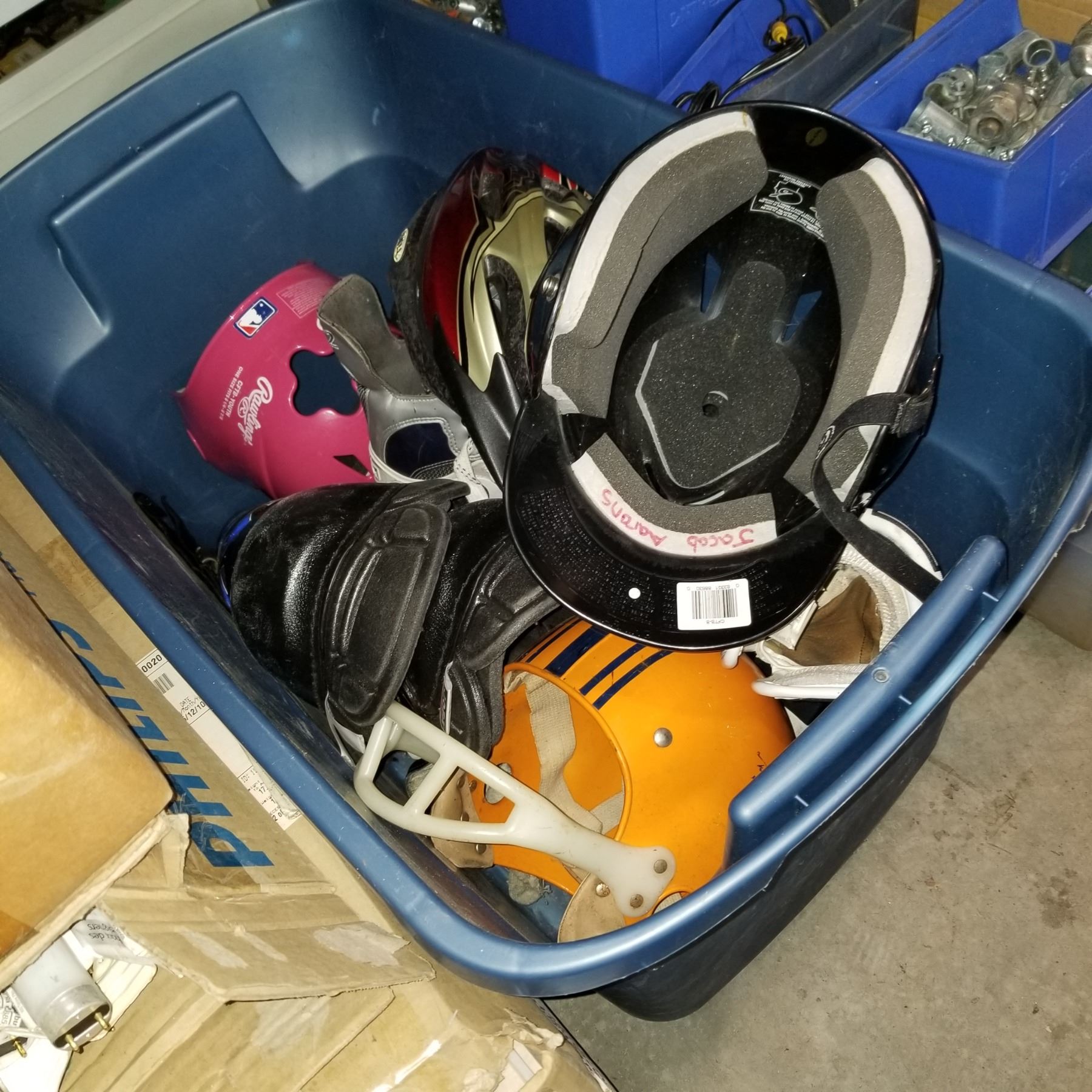 LARGE BLUE TOTE OF SPORTS EQUIPTMENT