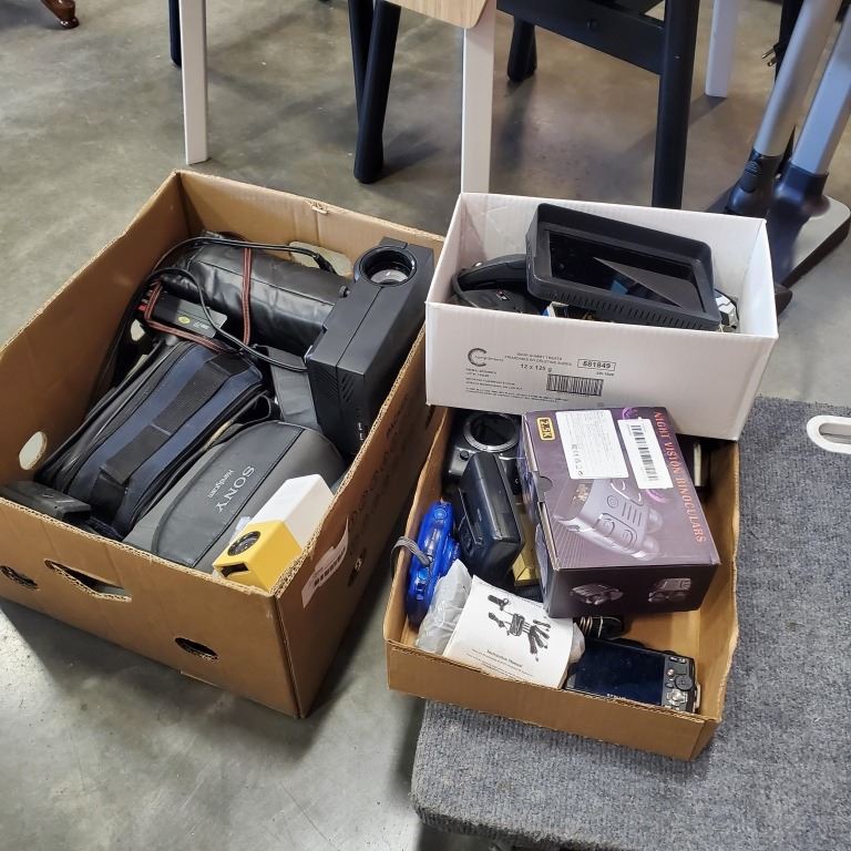 LARGE BOX OF ASSORTED ELECTRONICS - VINTAGE CAMERAS, CELL PHONES, PROJECTOR, ETC