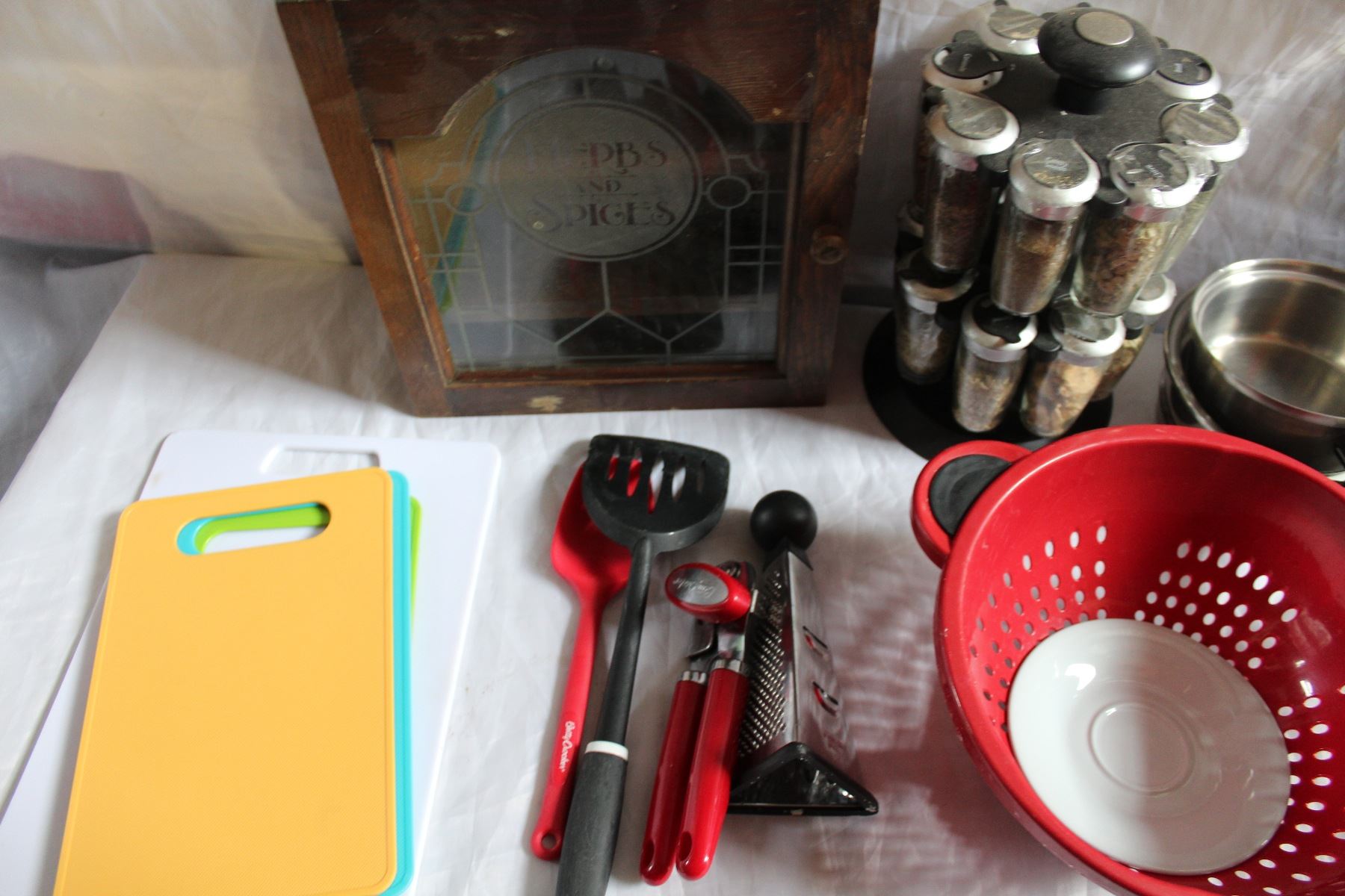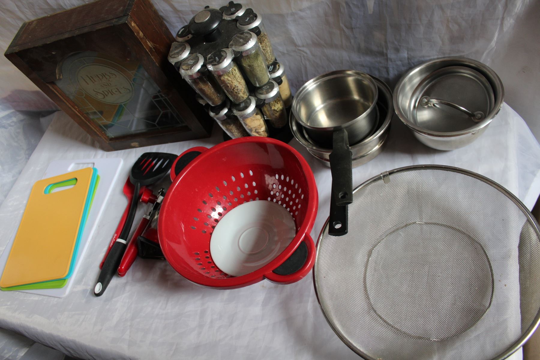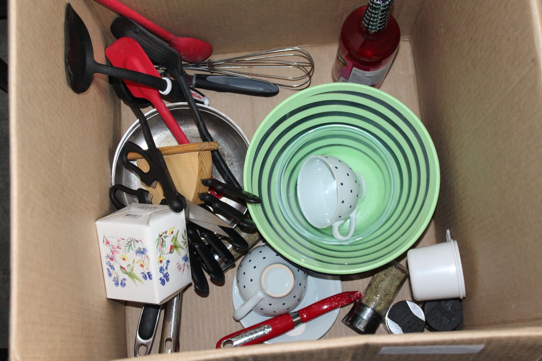 LARGE BOX OF COOKING SUPPLIES POTS AND PANS