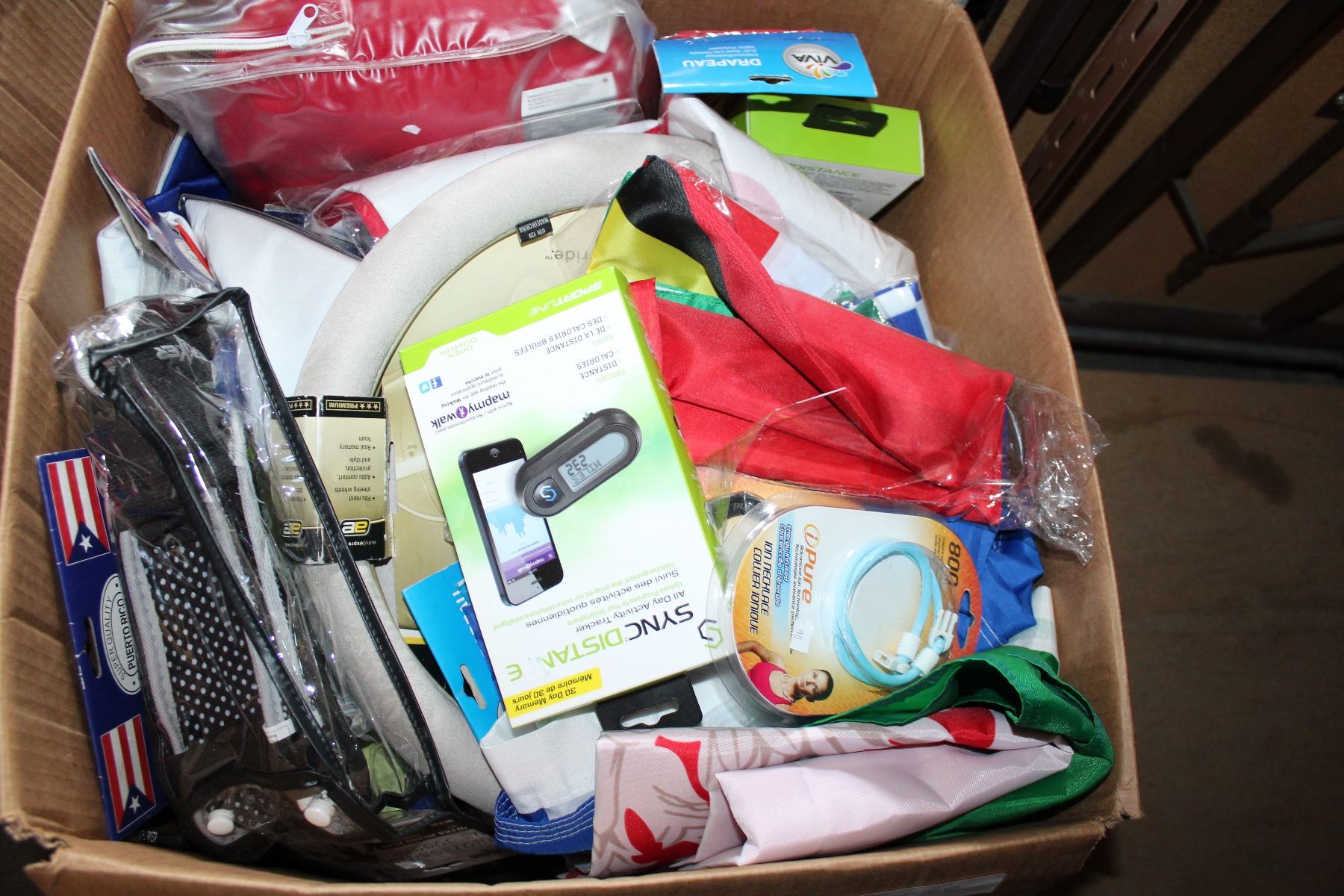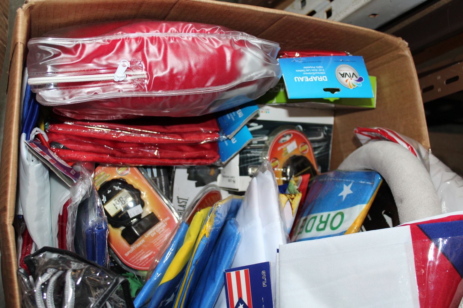 LARGE BOX OF FLAGS AND NEW ITEMS