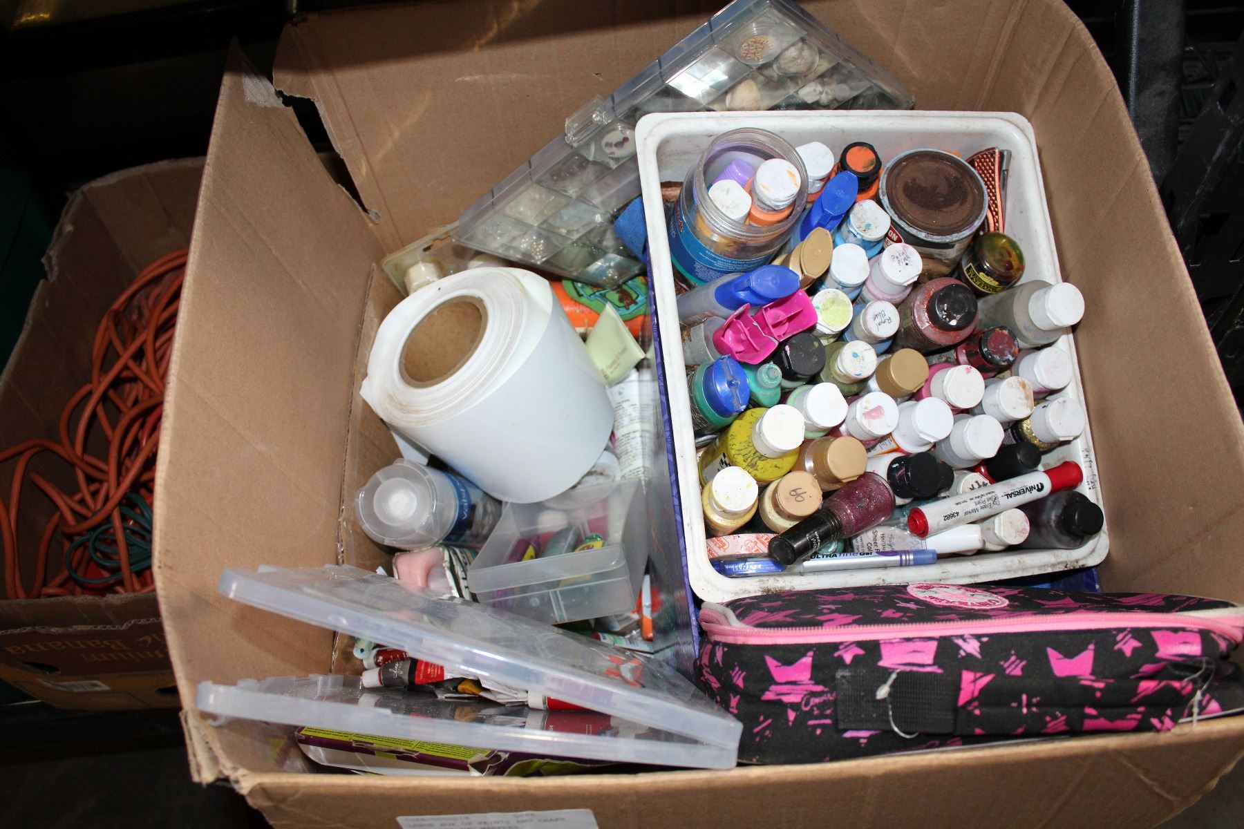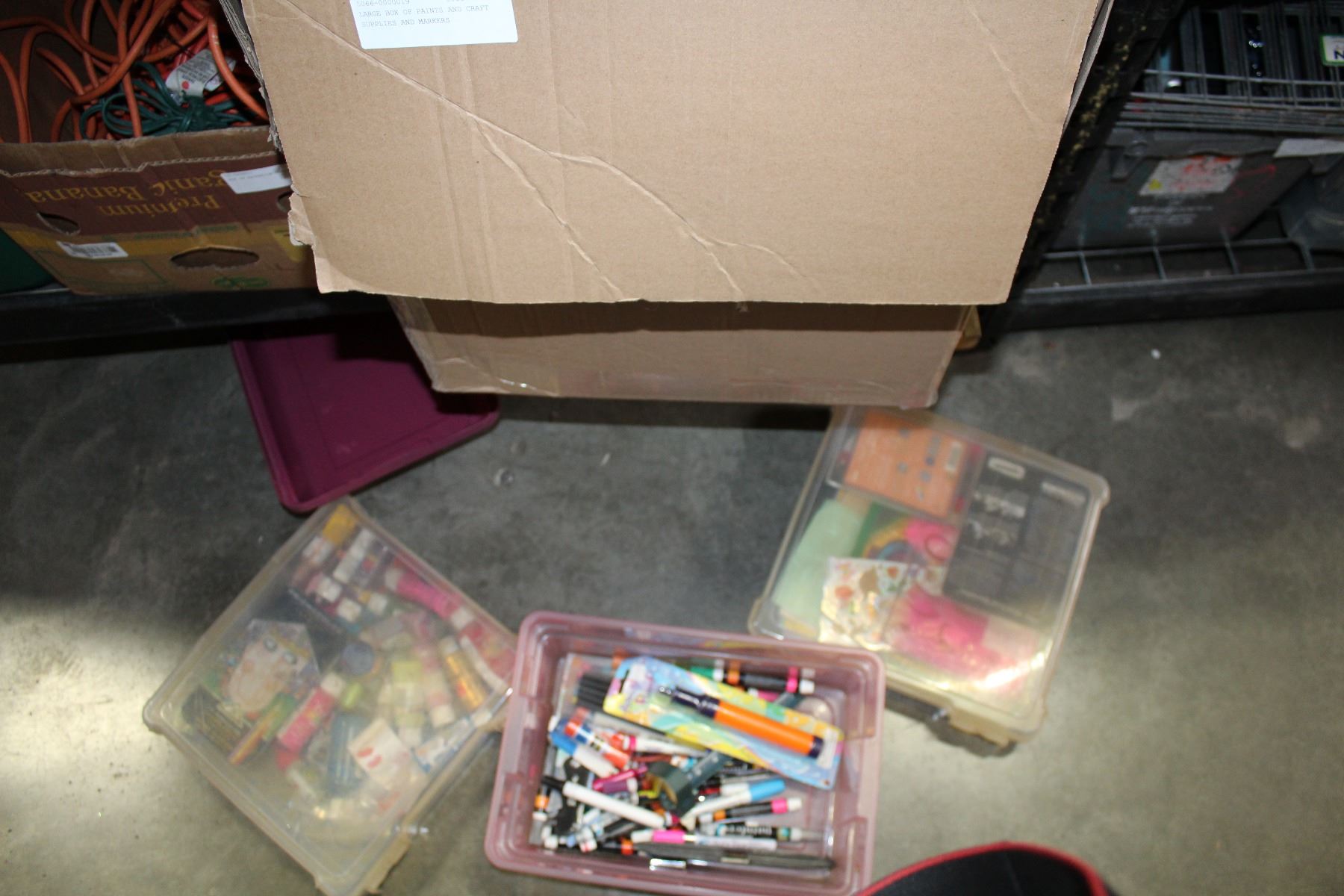 LARGE BOX OF PAINTS AND CRAFT SUPPLIES AND MARKERS
