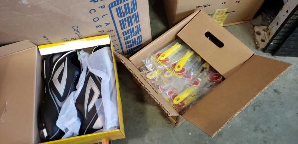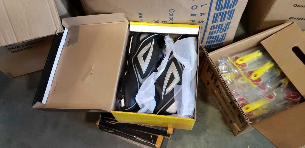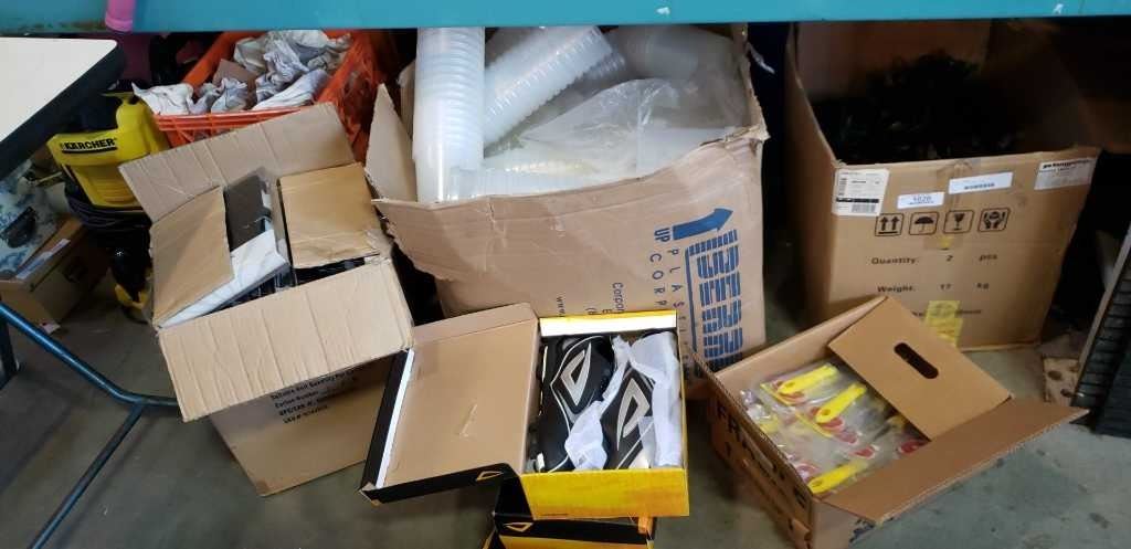 LARGE BOX OF SMALL PAILS, BOX OF GRAPEFRUIT KNIVES, IPAD CASES AND CLEATS