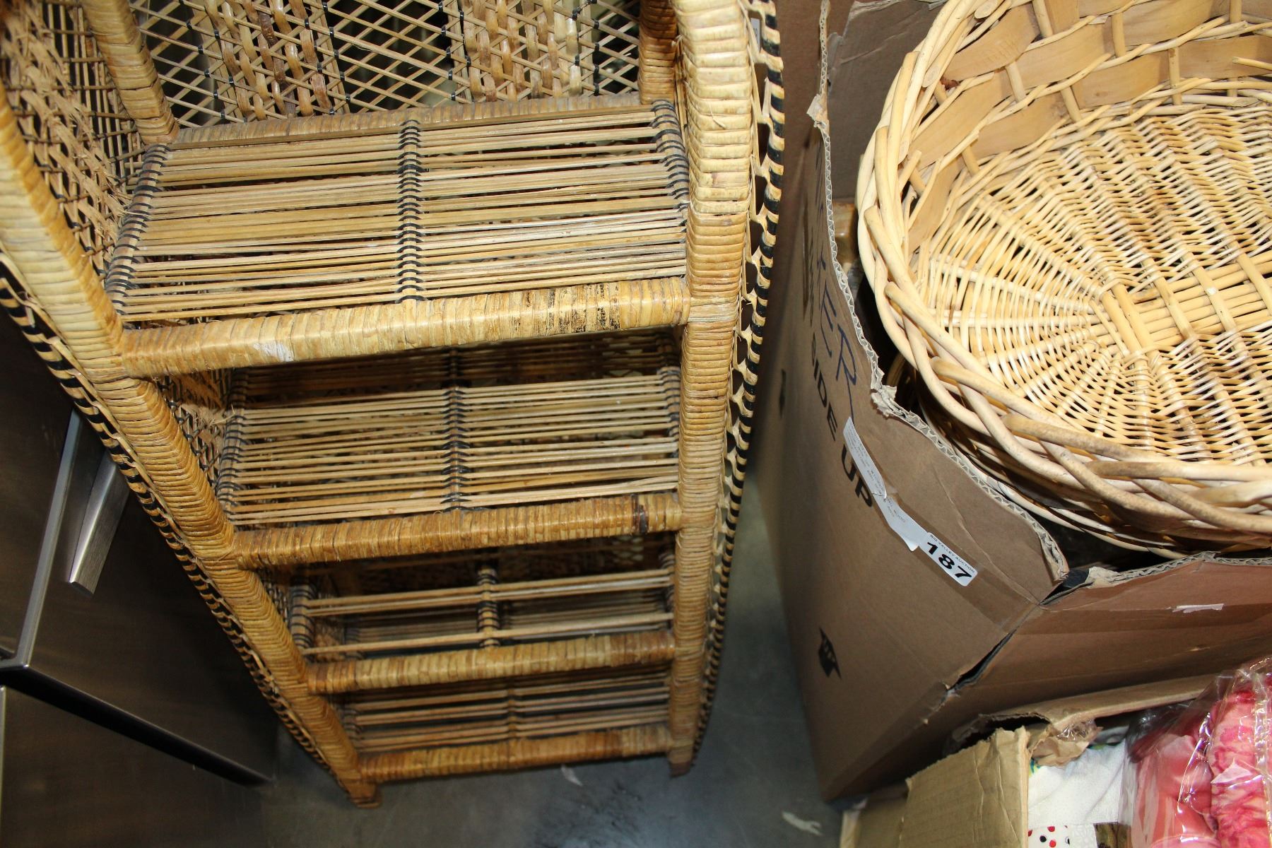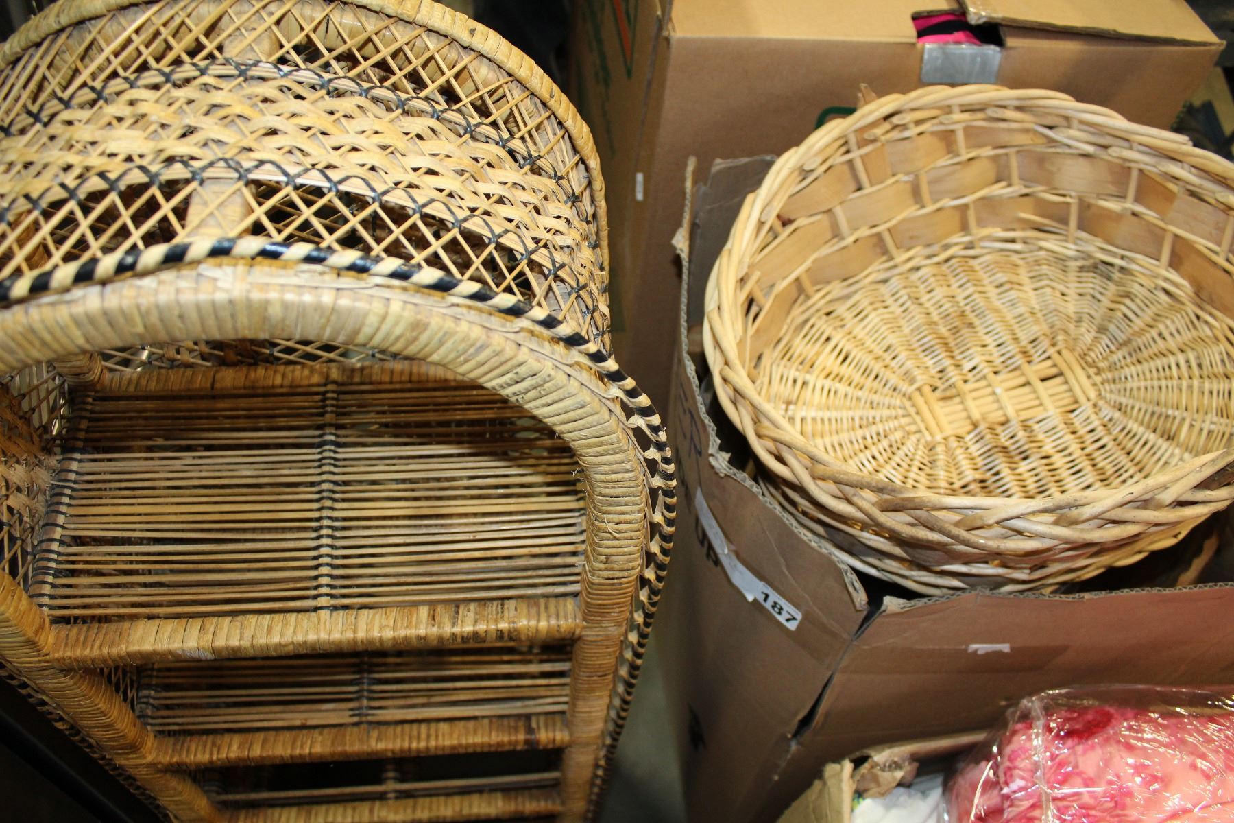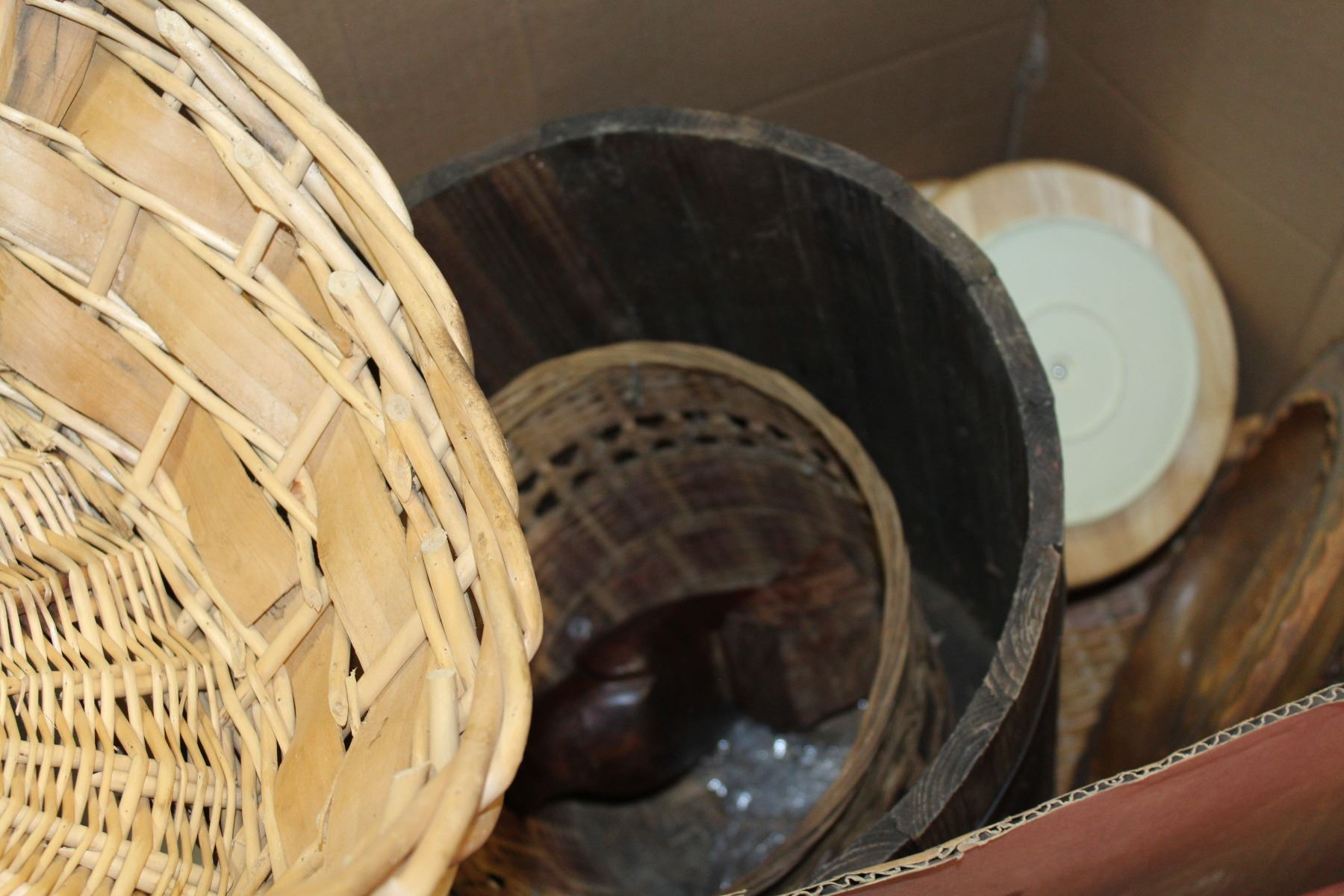 LARGE BOX OF WICKER AND WOOD DECORATIONS AND BOWLS AND SHELF