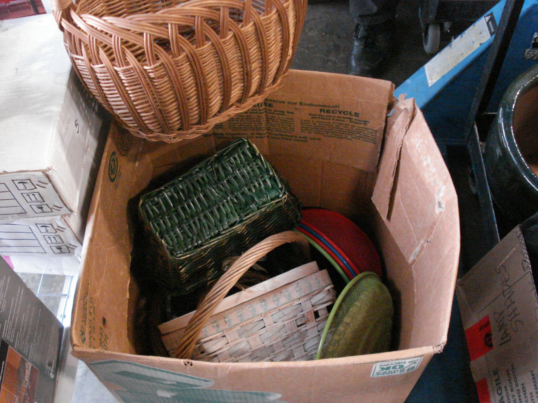 LARGE BOX OF WICKER BASKETS AND PLASTIC BOWLS