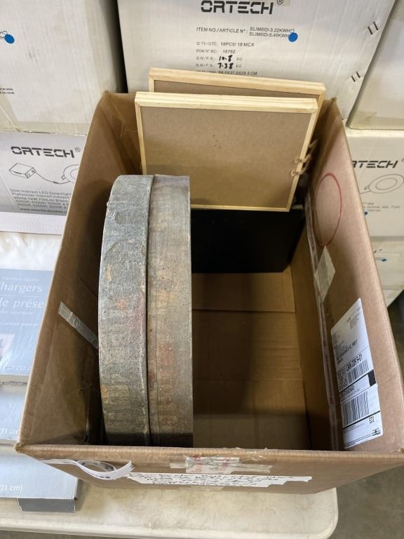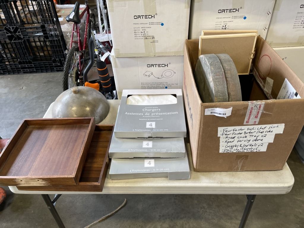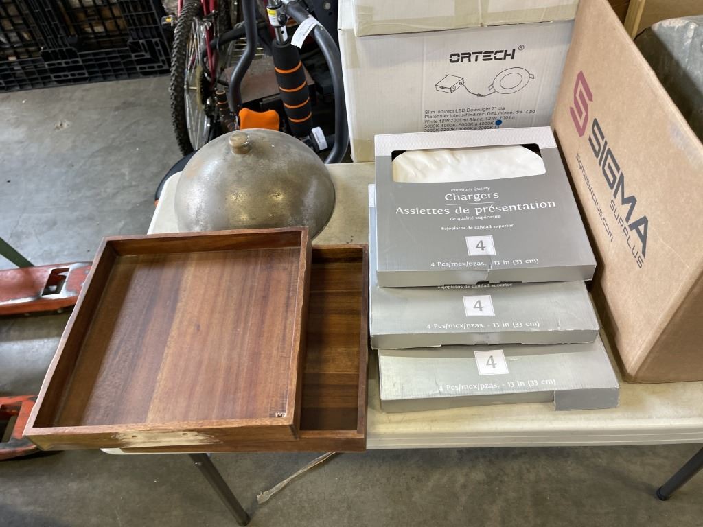 LARGE BOX OF WOOD TRAYS, CHALK SIGNS, CHARGER PLATES, ETC