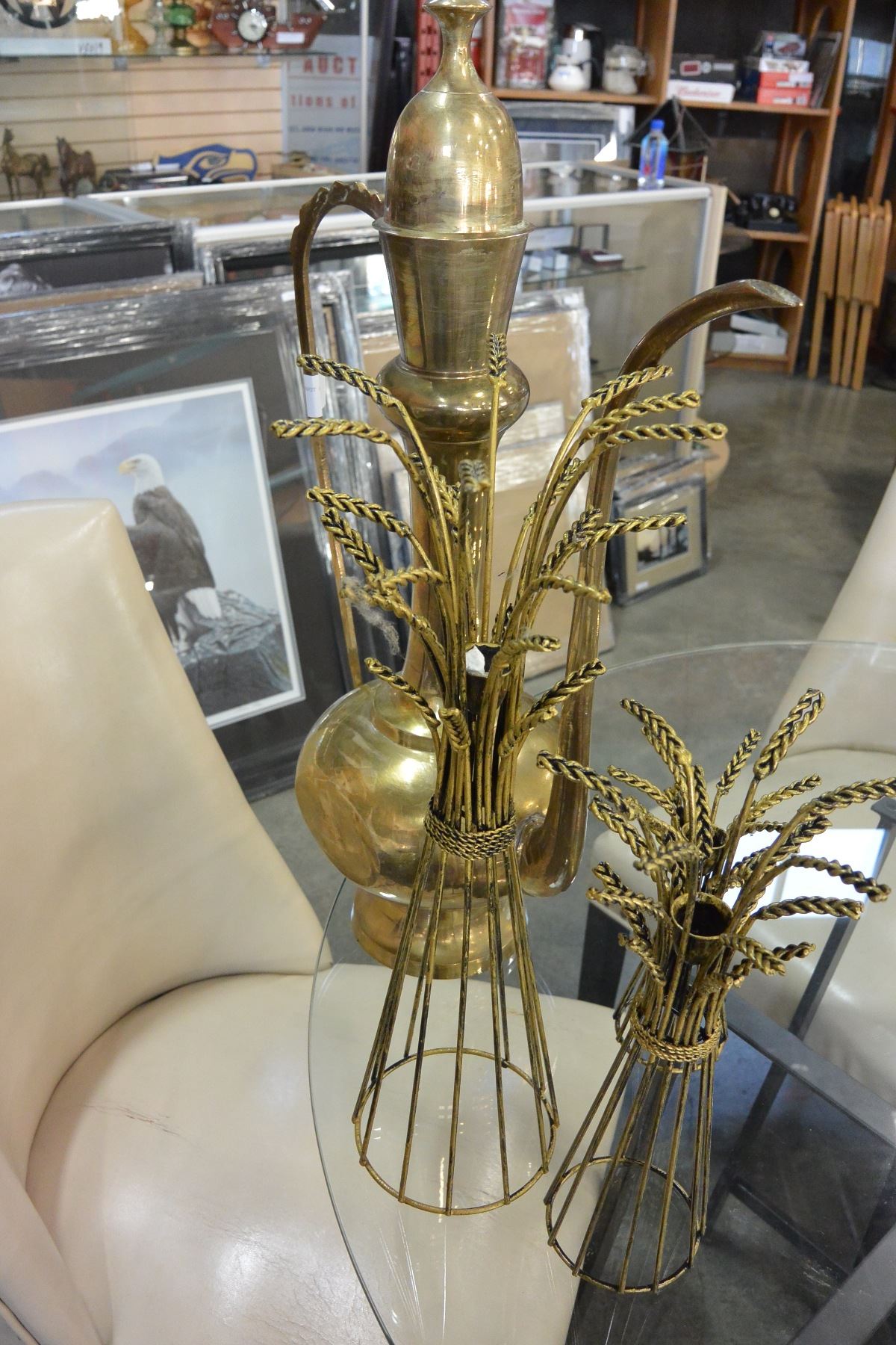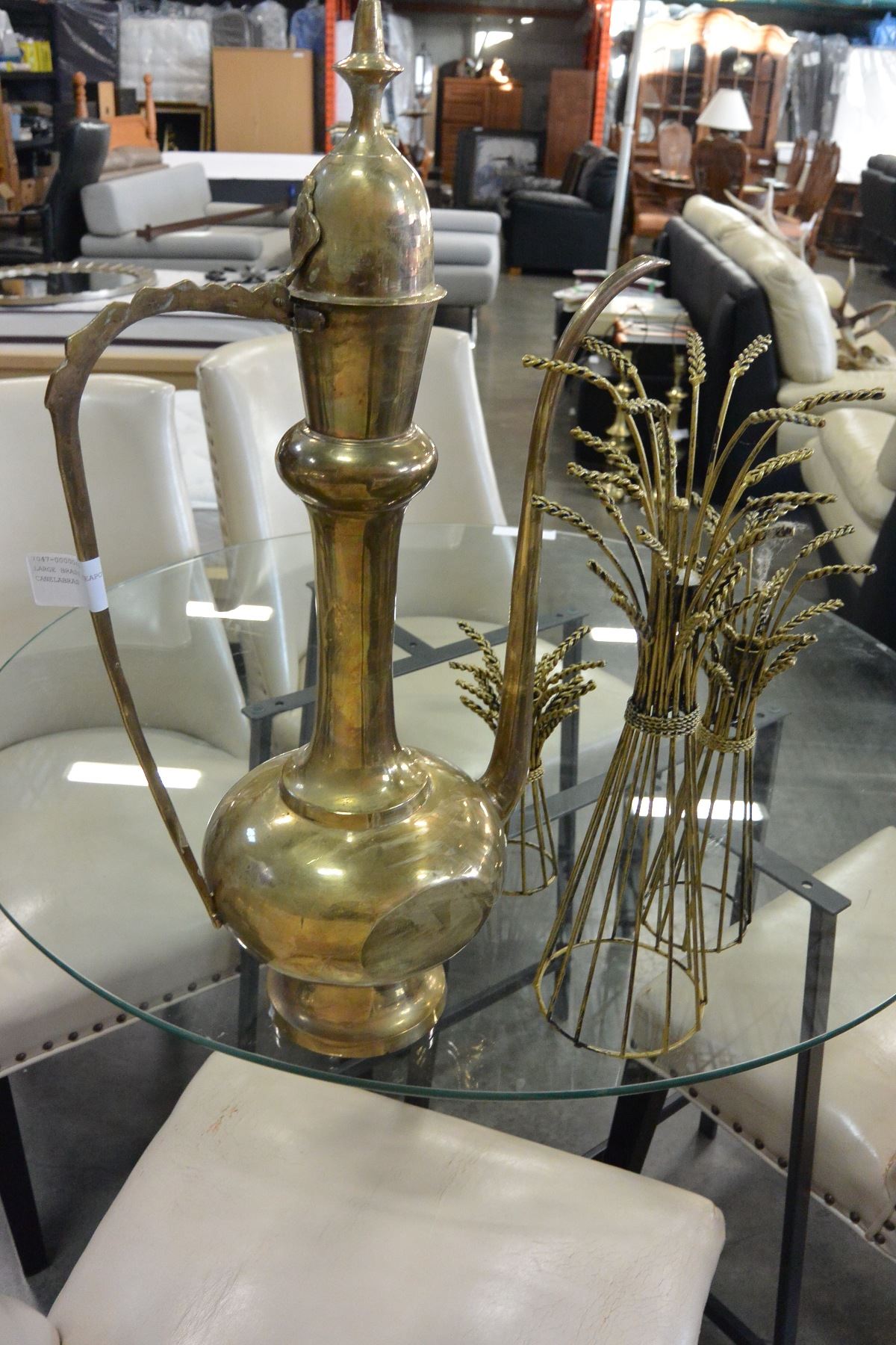 LARGE BRASS TEAPOT AND CANDLEABRAS