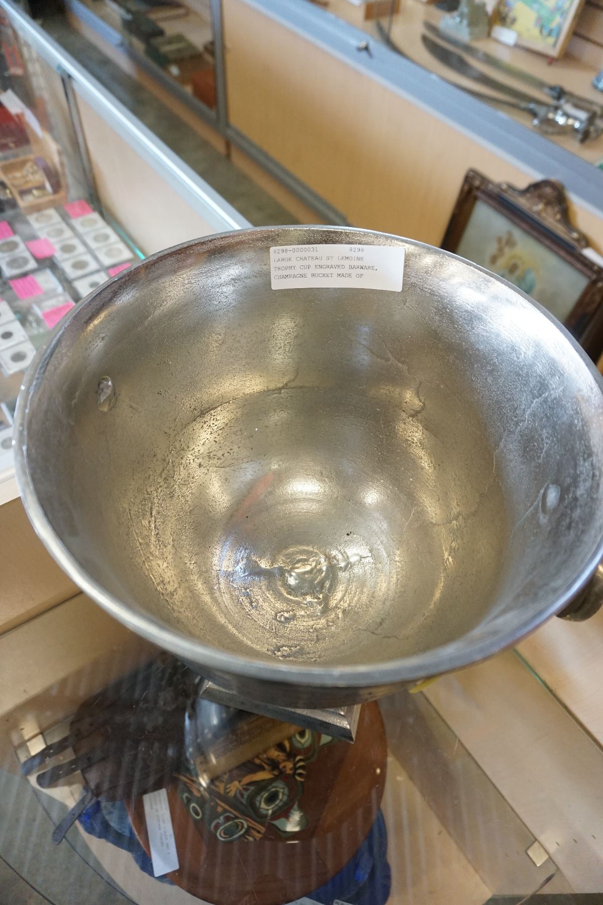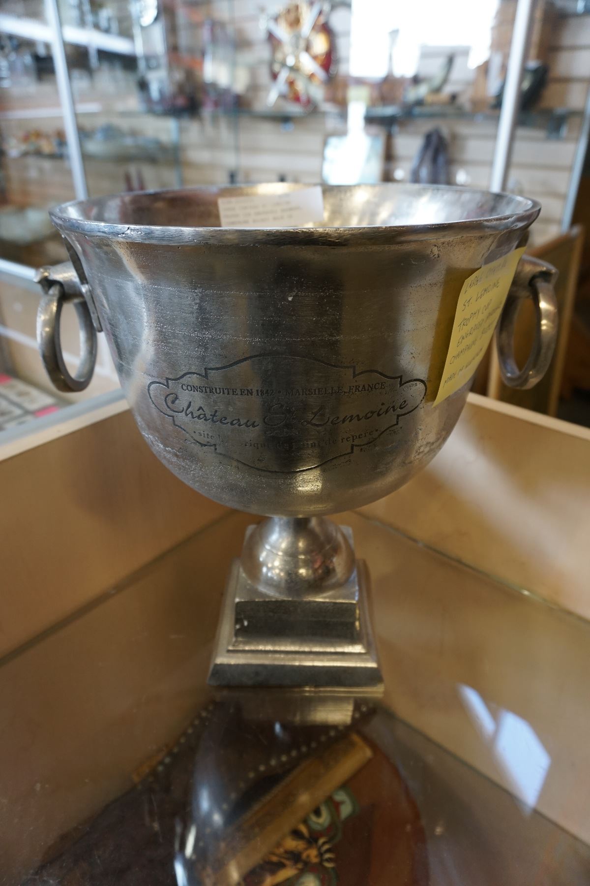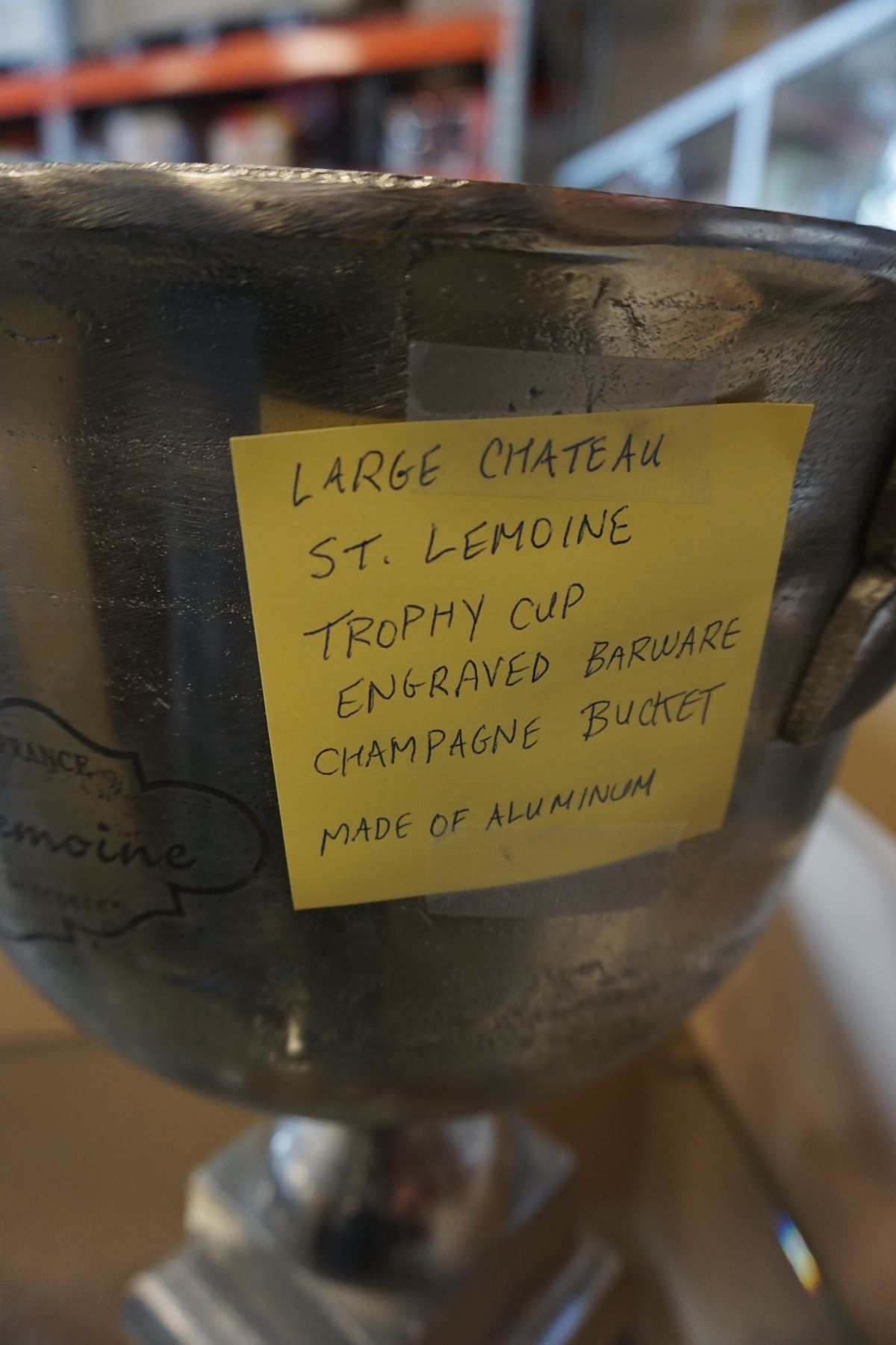 LARGE CHATEAU ST LEMOINE TROPHY CUP ENGRAVED BARWARE, CHAMPAGNE BUCKET MADE OF ALUMINUM
